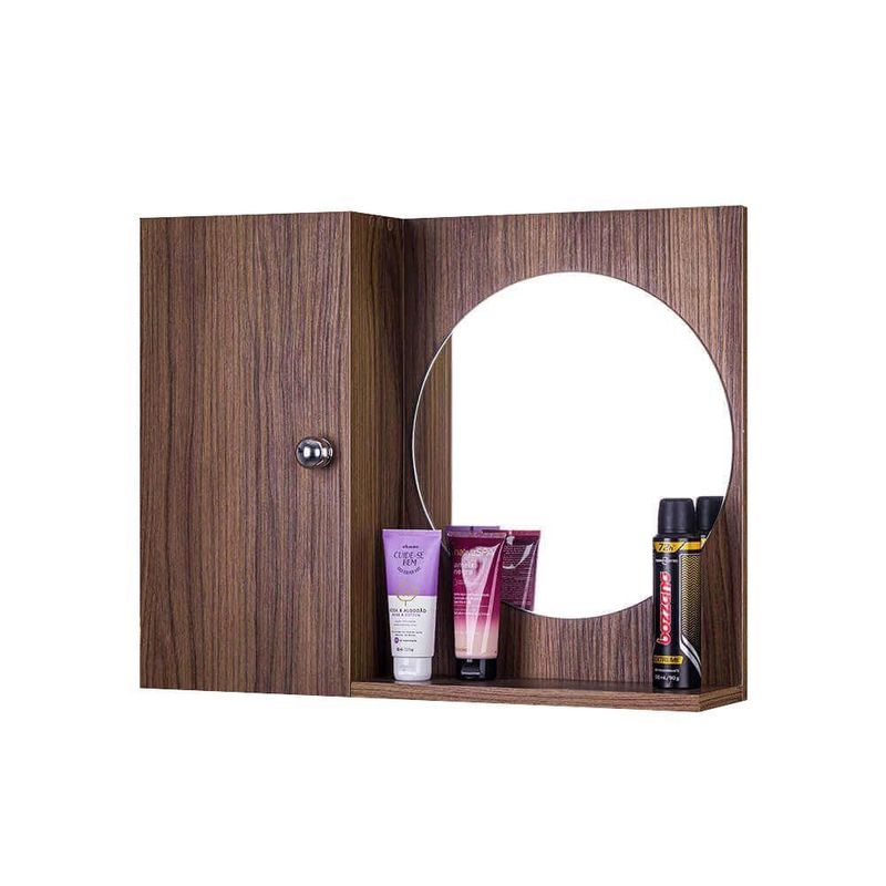 Armário Para Banheiro Com Espelho Redondo Madeira Escura Armário para Banheiro com Espelho Redondo Madeira Escura. Já vem montado, pronto para colocar na parede. É só abrir a caixa e instalar em seu banheiro. Acompanha 2 parafusos com buchas para instalar na parede. Obs: a colocação dele na parede é por conta do cliente, mas é bem fácil de fazer, basta uma furadeira, régua e lápis para marcar o de instalação. Basta colocar os dois parafusos na parede, depois encaixar o armário com espelho neles (tem 2 suportes metálicos atrás do armário, para encaixar nos parafusos). Armário para Banheiro com Espelho na cor Madeira Escura é ideal para organizar vários itens. Possui prateleira interna em vidro, armário com porta e amplo espelho. É a escolha perfeita para seu banheiro. Material: MDP 15mm Cor: Nogal Malaga (cor de madeira escura) Altura total: 46cm Largura total: 58cm Profundidade total: 12,5cm Instalação: a montagem e instalação do produto na parede são por conta do cliente Limpeza e conservação: recomenda-se a limpeza com pano úmido, não utilizar produtos abrasivos ou químicos Obs: Este anuncio inclui somente o armário com espelho, todos os itens de decoração das fotos não estão inclusos.Marca :MERCADO DAS PRATELEIRASGarantia: 3 Meses
