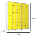 Armário Roupeiro Aço 20 Portas Academia Guarda Volume Trinco AmareloRoupeiro de Aço EA717 20 Portas com Trinco para Cadeadoarmário roupeiro de aço 20 portas organizador guarda-volumes vestiário academiaO Armário Roupeiro de Aço 20 Portas Vestiário Academia Guarda-Volumes com trinco para cadeados é perfeito para alojamentos, escritórios, almoxarifados, laboratórios, hospitais, farmácias, depósitos, academias, supermercados, vestiários, e diversos outros ambientes.Produto enviado desmontado, com baixíssimo custo de frete e fácil montagem, acompanhamanual e possui vídeo explicativo.O Armário Roupeiro De Aço 20 Portas Vestiário Academia Guarda-Volumes foi desenvolvido com aço de alta qualidade, garantindo maior robustez máxima de resistência à estrutura da peça, tornando seu tempo de vida útil mais elevado. Sua pintura eletrostática em tinta epóxi, proporciona ainda mais proteção a ela. Perfeita para a organização do seu ambiente.Ele é composto por 20 portas que cabem todos os modelos de capacetes e outros pertences. Super resistente, suporta até 20Kg bem distribuídos por compartimento. Possui pés niveladores para um perfeito acabamento e evitando assim riscos no piso. Porta com trinco para cadeado que permanece fechada mesmo que esteja sem o cadeado no momento - diferente do pitão tradicional que precisa ser amarrado para evitar que fique batendo - perfeito acabamento e praticidadeCaracterísticas do Produto- Quantidade de portas: 20- Chapa das prateleiras: #26 (0,45mm)- Dimensões (ALP/cm): 198 X 175 X 40- Pintura: Eletrostática / Epóxi- Peso suportado: 15Kg por compartimentoConteúdo da Embalagem- 20 Portas- 15 Prateleiras- 03 Bases- 03 Tetos- 05 Fundos- 06 Laterais- 06 Travas Inferior/Superior- 03 Trava Central- 02 Divisórias- 08 Pés niveladores + sapatas- 03 Kits de acessórios completo- 03 Manuais de MontagemGARANTIAS:- Garantia de 03 meses de fábrica contra defeitos de fabricação- Garantia extra de +03 meses da loja contra eventuais defeitos de fabricaçãoDesign Moderno e VersátilNão só funcional, o nosso roupeiro de aço também é um deleite visual. Com seu acabamentoelegante e design contemporâneo, ele se integra perfeitamente a qualquer ambiente, seja um escritório formal ou uma academia agitada. Não é apenas um item utilitário, é também uma adição estilosa ao seu espaço.Espaço e OrganizaçãoIdeal para armazenar pertences de funcionários em empresas ou roupas de treino em academias, este roupeiro possui compartimentos espaçosos. Cada seção foi pensada para maximizar o espaço, permitindo que você organize seus itens de maneira eficiente e sem amontoá-los. Diga adeus à desordem e olá à organização!Solução SustentávelFeito de aço, este roupeiro é uma alternativa ecológica aos móveis de madeira. Ao escolher este armário, você está fazendo uma escolha consciente para o planeta, sem comprometer a funcionalidade ou estética do produto.Praticidade no Dia a DiaO nosso roupeiro de aço é mais do que apenas um item de armazenamento: é a solução perfeita para o dia a dia corrido. Com compartimentos espaçosos e bem projetados, localizar seus pertences torna-se uma tarefa simples e rápida. Facilite sua rotina e nunca mais perca tempo buscando seus itens.Importante: Este produto é entregue desmontado, junto ao manual de instruções e todos os acessórios necessários para seu perfeito encaixe e uso. Indicamos que você contrate um profissional especializado para sua montagem; Certifique-se de que todas as característicasdo produto atendem sua necessidade antes de efetuar a compra, desta forma garantimos que você irá adquirir um excelente artigo que possa usufruir;Lembre-se de que as imagens do anúncio são ilustrativas, podendo suas cores tervariações em razão do monitor ou da luz.O Armário Roupeiro De Aço 20 Portas Vestiário Academia é fabricado pela Elite Aço, indústria de móveis de aço e tubular presente no mercado há mais de duas décadas, oferecendo produtos inovadores de alta qualidade e estilo para atender as necessidades de seus clientes.