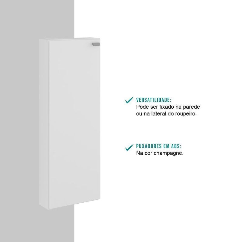 Armário Sapateira Utilitário 1 Porta Branco CarraroO Armário Sapateira Carraro é a peça ideal para ser utilizada em diferentes cômodos da casa, ajudando a manter todos os objetos em ordem e assim facilitando as tarefas do dia a dia. É uma solução indispensável para quem precisa de mais espaço e organização para o ambiente, pois conta com diversas prateleiras internas, além de permitir ser fixada tanto na parede como na lateral de roupeiros.Especificações do Produto:Medidas: Largura: 44 cm | Altura: 119,6 cm | Profundidade: 15,3 cmPeso: 11 KgMatéria Prima: MDPPortas: 1 Porta de batenteSistema Abertura: Dobradiça 26mmPuxador: ABSPrateleiras: 3 (4 nichos)Acessórios: Vareta em ABS nas prateleirasPeso suportado em cada prateleira: Até 10 KgGarantia:Os produtos possuem garantia de 03 meses (se em condições normais), contra defeito de fabricação, ou componentes utilizados.Esta garantia não cobre defeitos por inadequado ou abusivo, falta de cuidados e desbotamento dos revestimentos.Condições de perda da garantia:- Mau ou manuseio incorreto.- Desbotamento ca pela exposição direta da luz solar.- Danos cas por agentes da , como inundações ou acidentes de qualquer espécie.- indevido de produtos abrasivos para realizar a limpeza.- Decurso do prazo estabelecido.Recomendações para uma boa conservação:- Dicas para limpeza e conservação do seu produto, você encontrará no esquema de montagem que o acompanha.Informações importantes:- Trabalhamos para apresentar imagens fiéis ao produto real. Porém, as cores podem sofrer variações de acordo com o monitor, iluminação do ambiente em que se encontram e até por sua percepção visual comparado ao ambiente residencial.- Desta forma, as imagens são meramente ilustrativas.- Todos os objetos decorativos não acompanham o produto.- O produto é enviado desmontado.- O produto acompanha manual com instruções para a montagem.- A empresa Móveis Carraro não realiza o serviço de montagem.PERGUNTAS FREQUENTES- Existem outras cores disponíveis?Sim, este produto possui outras cores disponíveis em outros anúncios.- Vocês m para todas as regiões do Brasil? De que forma é feita a ?Sim, mos para todas as regiões do Brasil. E a é realizada por s parceiras.- Este produto é novo ou ?Todos os s produtos são novos. E acompanham e certificado de garantia.- Recebo o produto montado?Não, este produto é enviado desmontado. Junto com ele é enviado manual com instruções para a montagem.- Vocês realizam a montagem do produto?Não possuímos o serviço de montagem. Altura (cm): 119,6 cm | Estado de Origem: RS | Cor Via Varejo: Branco | Material para Filtro: Madeira | Família da Cor: Branco | Peso: 11.00 | Espelho: Sem Espelho | Profundidade (cm): 15,3 cm | Cor: Branco | Pés: Sem Pés | Largura do produto (cm): 44 cm | PrzEx: 3 | Cômodo Indicado: Cozinhas | Tipo: Aéreo | Produto: Armário Multi | Nome do Simples no Fornecedor: Armário Aéreo Utilitário 1 Porta Branco Carraro | Instruções/Cuidados: Nenhuma Informação | Conteúdo da Embalagem: 1 Armário Aéreo Utilitário 1 Porta Branco Carraro | Peso do Produto com Embalagem (kg): 11 kg | Produto precisa de Montagem?: Sim, montagem e instalação do Painel | Altura do Produto com Embalagem (cm): 5,5 cm | Largura do Produto com Embalagem (cm): 123,5 cm | Comprimento do Produto com Embalagem (cm): 44,5 cm | Descrição do Tamanho: 5,5 cm x 123,5 cm x 44,5 cm