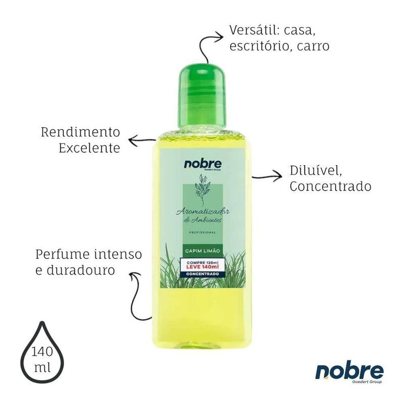 Aromatizante De Ambiente 140ml Nobre - Capim Limão Concentrado, Perfume DuradouroTransforme a atmosfera da sua casa, escritório ou comércio com o Aromatizante de Ambiente Nobre. Com fórmula concentrada, ele perfuma de forma intensa e duradoura, criando uma sensação de frescor e bem-estar em poucos segundos. Perfeito para quem valoriza ambientes cheirosos e acolhedores o dia todo.• Alta concentração de fragrânciaPerfuma o ambiente com poucas borrifadas, garantindo economia e intensidade.• Longa duraçãoFragrância permanece no ar por horas, mantendo a sensação de limpeza e conforto.• Aplicação práticaFrasco com borrifador facilita o uso em qualquer cômodo.• VersátilIdeal para salas, quartos, banheiros, escritórios, lojas e veículos.Especificações do produto:Volume: 140mlTipo: Aromatizante líquido concentrado com borrifadorModo de uso: Borrifar no ambiente desejado, mantendo distância de tecidos e superfícies delicadasIndicação: Uso em ambientes internos diversosRendimento: Alta performance com poucas borrifadasValidade: Vide embalagemArmazenamento: Conservar ao abrigo da luz e calorPrecauções: Não ingerir. Evitar contato com olhos e mucosas. Manter fora do alcance de crianças e animaisTransforme a atmosfera da sua casa, escritório ou comércio com o Aromatizante de Ambiente Nobre. Com fórmula concentrada, ele perfuma de forma intensa e duradoura, criando uma sensação de frescor e bem-estar em poucos segundos. Perfeito para quem valoriza ambientes cheirosos e acolhedores o dia todo.• Alta concentração de fragrânciaPerfuma o ambiente com poucas borrifadas, garantindo economia e intensidade.• Longa duraçãoFragrância permanece no ar por horas, mantendo a sensação de limpeza e conforto.• Aplicação práticaFrasco com borrifador facilita o uso em qualquer cômodo.• VersátilIdeal para salas, quartos, banheiros, escritórios, lojas e veículos.Especificações do produto:Volume: 140mlTipo: Aromatizante líquido concentrado com borrifadorModo de uso: Borrifar no ambiente desejado, mantendo distância de tecidos e superfícies delicadasIndicação: Uso em ambientes internos diversosRendimento: Alta performance com poucas borrifadasValidade: Vide embalagemArmazenamento: Conservar ao abrigo da luz e calorPrecauções: Não ingerir. Evitar contato com olhos e mucosas. Manter fora do alcance de crianças e animais