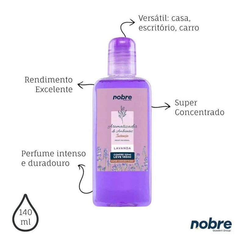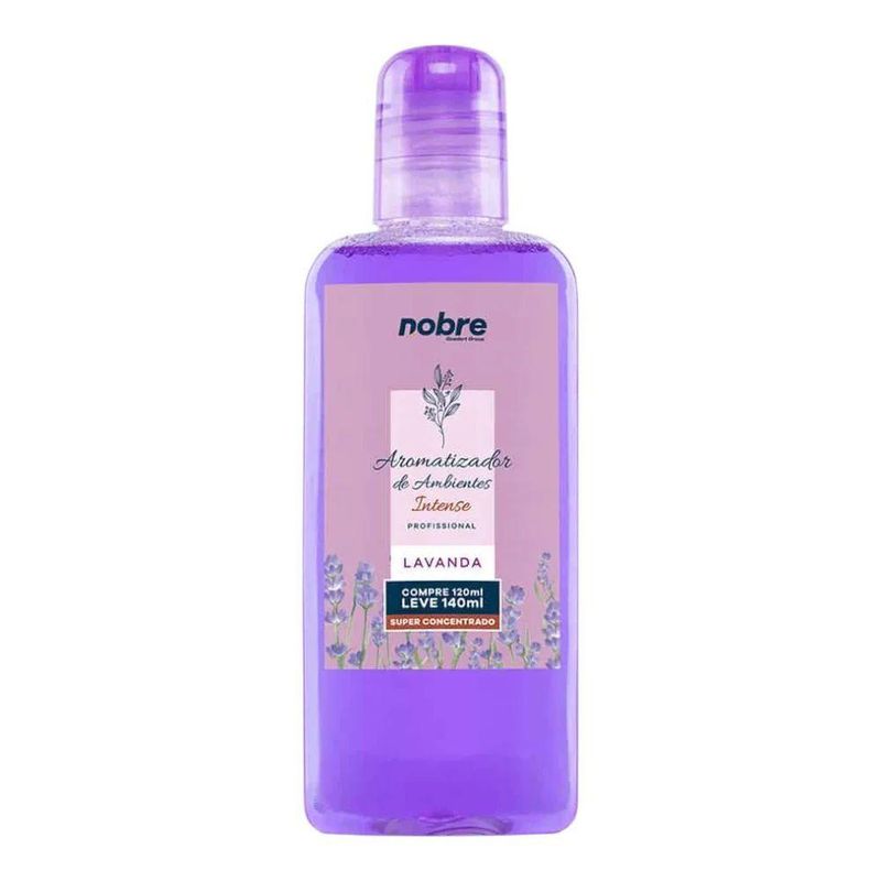 Aromatizante De Ambiente 140ml Nobre - Lavanda Super Concentrado, Perfume DuradouroTransforme a atmosfera da sua casa, escritório ou comércio com o Aromatizante de Ambiente Nobre. Com fórmula concentrada, ele perfuma de forma intensa e duradoura, criando uma sensação de frescor e bem-estar em poucos segundos. Perfeito para quem valoriza ambientes cheirosos e acolhedores o dia todo.• Alta concentração de fragrânciaPerfuma o ambiente com poucas borrifadas, garantindo economia e intensidade.• Longa duraçãoFragrância permanece no ar por horas, mantendo a sensação de limpeza e conforto.• Aplicação práticaFrasco com borrifador facilita o uso em qualquer cômodo.• VersátilIdeal para salas, quartos, banheiros, escritórios, lojas e veículos.Especificações do produto:Volume: 140mlTipo: Aromatizante líquido concentrado com borrifadorModo de uso: Borrifar no ambiente desejado, mantendo distância de tecidos e superfícies delicadasIndicação: Uso em ambientes internos diversosRendimento: Alta performance com poucas borrifadasValidade: Vide embalagemArmazenamento: Conservar ao abrigo da luz e calorPrecauções: Não ingerir. Evitar contato com olhos e mucosas. Manter fora do alcance de crianças e animaisTransforme a atmosfera da sua casa, escritório ou comércio com o Aromatizante de Ambiente Nobre. Com fórmula concentrada, ele perfuma de forma intensa e duradoura, criando uma sensação de frescor e bem-estar em poucos segundos. Perfeito para quem valoriza ambientes cheirosos e acolhedores o dia todo.• Alta concentração de fragrânciaPerfuma o ambiente com poucas borrifadas, garantindo economia e intensidade.• Longa duraçãoFragrância permanece no ar por horas, mantendo a sensação de limpeza e conforto.• Aplicação práticaFrasco com borrifador facilita o uso em qualquer cômodo.• VersátilIdeal para salas, quartos, banheiros, escritórios, lojas e veículos.Especificações do produto:Volume: 140mlTipo: Aromatizante líquido concentrado com borrifadorModo de uso: Borrifar no ambiente desejado, mantendo distância de tecidos e superfícies delicadasIndicação: Uso em ambientes internos diversosRendimento: Alta performance com poucas borrifadasValidade: Vide embalagemArmazenamento: Conservar ao abrigo da luz e calorPrecauções: Não ingerir. Evitar contato com olhos e mucosas. Manter fora do alcance de crianças e animais
