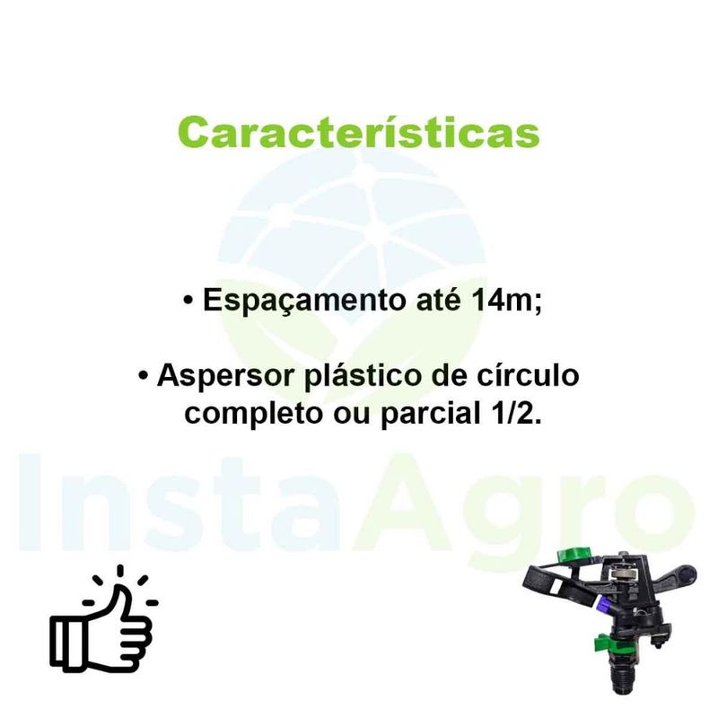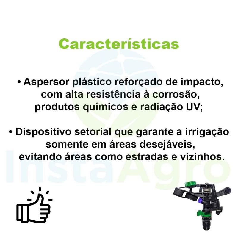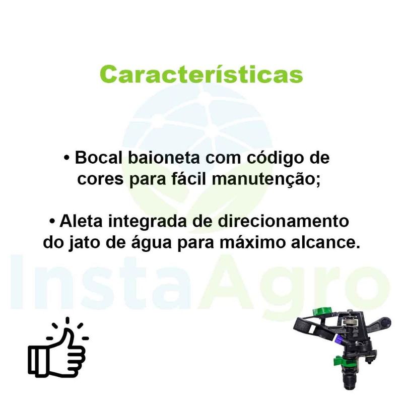 Aspersor 427b Bocal 3.5mm Azul 660 L/h NaanDanJain - 20 Un • Espaçamento até 14m; • Aspersor plástico de círculo completo ou parcial 1/2; • Bocal baioneta com código de cores para fácil manutenção; • Aleta integrada de direcionamento do jato de água para máximo alcance; • Aspersor plástico reforçado de impacto, com alta resistência à corrosão, produtos químicos e radiação UV; • Dispositivo setorial que garante a irrigação somente em áreas desejáveis, evitando áreas como estradas e vizinhos.
