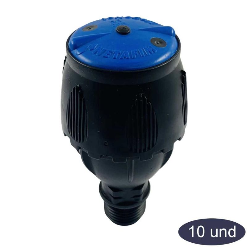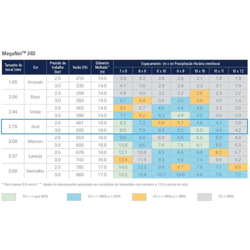 Aspersor Meganet 24d Azul 450 L/h Netafim 10 Unidades Aspersor para irrigação em área total com vazão de 450 L/h para irrigação de pastagens e hortaliças. Dados TécnicosBocal: 2.79 mm;Cor: Azul;Vazão: 450 L/h;Pressão de Trabalho: 2.3 bar;Diâmetro Molhado: 16 m;Conexão: Rosca macho de 1/2". Características Técnicas Aspersor pop-up regular (não autocompensado);Pode ser autocompensado acoplado a um regulador de pressão;Possui proteção contra raios ultravioletas e produtos químicos;Produzido sob a norma ISO 8026;Ampla faixa de vazão;Trajetória da água: 24 graus;Dois jatos simétricos;Filtro interno de tela;Pop-up (partes internas sempre protegidas). AplicaçãoHortifruti;Irrigação de campo aberto em geral;Mitigação dos efeitos de geadas;Pastagem;Produção de mudas.