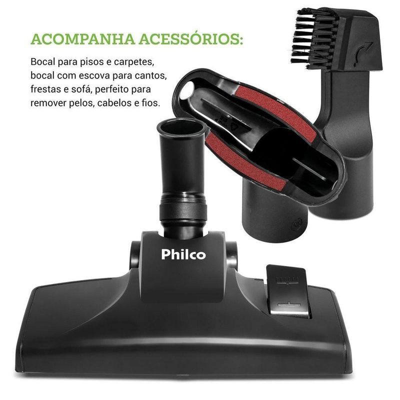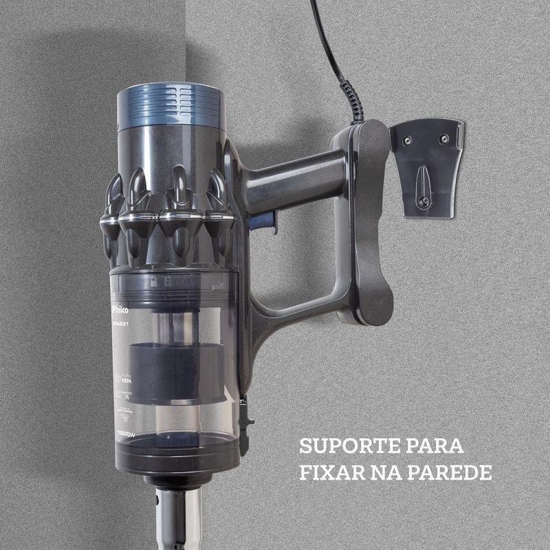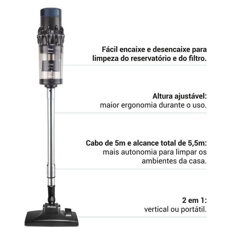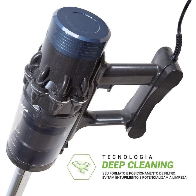 Aspirador De Pó 2 Em 1 Philco Deep Cleaning 1600W PAS31 110VDeixe sua casa sempre limpa com mais praticidade e conforto com o Aspirador de Pó 2 em 1 Philco Deep Cleaning 1600W PAS31. Com alto poder de sucção e design funcional, o Aspirador Philco transforma a limpeza do dia a dia em uma tarefa simples e eficaz. Sinta o bem-estar de viver em um ambiente limpo, confortável e seguro para toda a família.Graças à potência de 1600W e à tecnologia Deep Cleaning, o Aspirador de Pó Philco oferece uma limpeza profunda sem entupimentos, mantendo o desempenho constante. O reservatório de 1 litro é removível e permite esvaziamento fácil com apenas um toque, garantindo agilidade e higiene no uso diário.Com formato 2 em 1, você pode utilizar o Aspirador PAS31 como aspirador vertical ou portátil, adaptando-se a diferentes cômodos e superfícies. Ele acompanha diversos bocais, para pisos, carpetes, cantos, frestas e estofados; possui altura ajustável, tornando a experiência mais ergonômica e confortável.Além disso, o cabo com alcance total de 5,5 metros oferece autonomia para limpar vários ambientes sem trocar de tomada. Com o Aspirador 2 em 1 Deep Cleaning Philco, você otimiza seu tempo, melhora a qualidade do ar e garante mais tranquilidade para sua rotina. Escolha o Aspirador de Pó que acompanha o ritmo da sua vida.Principais Características- Suporte de Parede- Filtro HEPA- Haste telescópica: 47cm-75cm- Giro da base: 180°- Capacidade de sucção: 181- Rodinhas para movimentação- Acessórios: Bocal cantos e frestas + escova, bocal sofá, bocal pisos e carpetes e suporte de parede- Tamanho da base: 26x8 cm- 5.5m de alcance- 1L de capacidade total do reservatório de pó- Especificação do plug: 10 A.Observação: Somente faturamos para o nosso consumidor final, ou seja, não faturamos pedidos para CNPJ por este portal de vendas.Especificações TécnicasMarca: PhilcoModelo: PAS31Cor: Cinza AzulFunção Soprar: NãoAspira Líquidos: NãoEstado: NovoCapacidade (L): 1LFiltro: HepaAcessórios: Bocal para cantos e frestas + escova, bocal para sofá, bocal para pisos e carpetes, suporte de paredePotência (W): 1600WComprimento cordão elétrico (metros): 5,5mConsumo (kW/h): 0,47kW/h (127V) / 0,46kW/h (220V)Porta fio: NãoTipo: PortátilGarantia (meses): 12