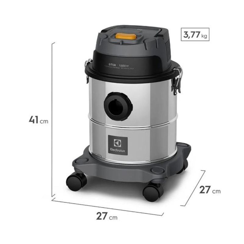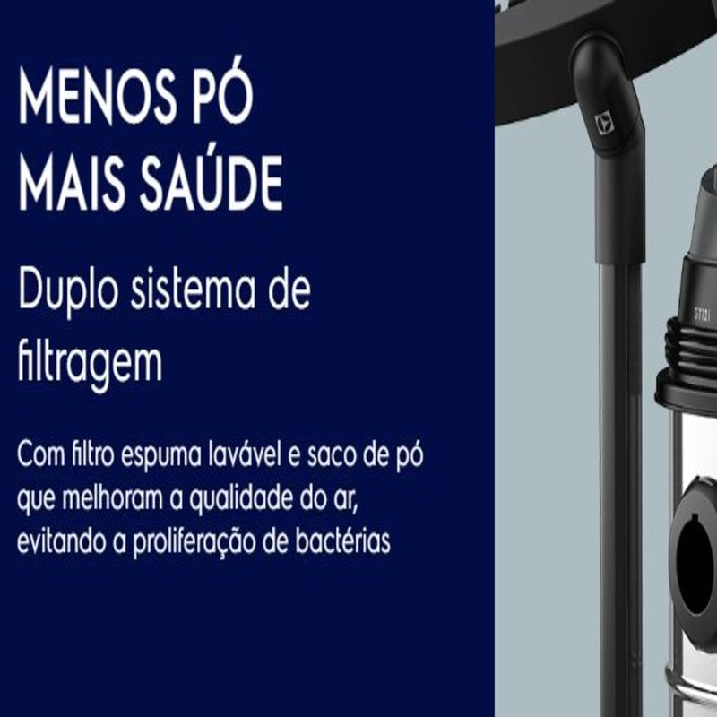- Destaques: • Versatilidade e robustez para limpar todos os tipos de piso com o Aspirador de Pó e Água em Inox GT12I Electrolux, que possui funções e acessórios que facilitam a limpeza até dos cantos mais difíceis com praticidade e resistência. • O design moderno com barril em inox de 12L e o motor com potência de 1500W fornecem capacidade para uma limpeza completa de áreas internas e externas, aspirando água e pó em um fluxo constante e controlável de acordo com a necessidade. • O aspirador ainda conta com função sopro, ideal para soprar folhas e pequenas sujeiras sem a necessidade do uso de água, além de encher balões e colchões de ar e muito mais. • Para melhor qualidade de limpeza ele possui duplo sistema de filtragem, com filtro espuma lavável e saco de pó que garantem melhor qualidade de ar. Possui a tecnologia TermoControl que protege o motor do seu aspirador em caso de superaquecimento o desligando, trazendo mais vida útil ao seu produto” • A alça ergonômica, os rodízios 360° e o cabo elétrico com 3,5m dão mobilidade total para levar o aspirador onde precisar. Os tubos extensores permitem que você alcance mais longe, e os bocais especializados facilitam a limpeza de cantos e frestas ou de pisos, ao usar o bocal com cerdas. O suporte para acessórios ajuda a manter a organização ao usá-los, e o suporte para cabo elétrico deixa o armazenamento mais fácil. Quando alcançar cantos mais difíceis se torna um desafio, os acessórios oferecem a ajuda que você precisa. • Cabo elétrico de 3,5m: Alcança mais longe com menos trocas de tomada e acompanha suporte organizador. • TermoControl: Aviso de segurança caso o aspirador seja conectado a uma voltagem diferente da ideal. • Acessórios: Bocal para cantos e frestas, tubos extensores e bocal para piso com cerdas. • Sistema duplo de filtragem: Filtro de espuma lavável e saco de pó para melhor limpeza e qualidade do ar. • Alça ergonômica e rodízio 360°: Mobilidade total para alcançar os lugares mais difíceis. • Potência de 1500W: Poder de sucção regulável para aspirar água e pó em ambientes internos e externos. • Barril de inox de 12L: Resistência, modernidade e alta capacidade para uma limpeza completa. • Função sopro: Sopre folhas e pequenas sujeiras, evitando o uso de água. - Detalhes: • Sua casa limpa com praticidade e robustez: Barril de Inox de 12L, 1500W de potência e Duplo sistema de filtragem. • Robustez e performance em um só produto: Conheça o aspirador especialista em limpeza pesada de áreas internas e externas. • Design moderno e resistente: Barril de Inox de 12L. Um reservatório resistente, com design elegante e grande capacidade para qualquer tipo de limpeza. • Poder para qualquer situação: 1500W de potência. Aspira sólidos e todos os tipos de líquidos, exceto os inflamáveis. Tanto em espaços internos como ambientes externos. • Menos pó, mais saúde: Duplo sistema de filtragem. Com filtro espuma lavável e saco de pó que melhoram a qualidade do ar, evitando a proliferação de bactérias. • Design moderno com alta capacidade e potência ideal para qualquer tipo de limpeza. • ThermoControl Technology: Protege o motor do seu aspirador em caso de superaquecimento o desligando, trazendo mais vida útil ao seu produto. • Interrupção inteligente de sucção: Seu aspirador desliga automaticamente a sucção quando atinge a capacidade máxima do barril de inox. • Função sopro: Facilidade na hora de encher balões, colchões de ar e muito mais. • Alcance total de 5,4m: Seu aspirador onde você precisar. • Suporte para acessórios: Praticidade e organização, sempre. • Bocal para cantos e frestas: Alcança e deixa limpo cada cantinho. • Tubos extensores: Mais praticidade e alcance na limpeza. - Especificações: • Modelo: GT12I• Altura do produto: 420mm• Largura do produto: 272mm• Profundidade do produto: 272mm• Peso do produto: 3.3Kg• Altura do produto embalado: 405mm• Altura (caixa master): 405mm• Largura (caixa master): 280• Profundidade (caixa master): 280• Peso bruto (caixa master): 3,3• Tensão: 127v