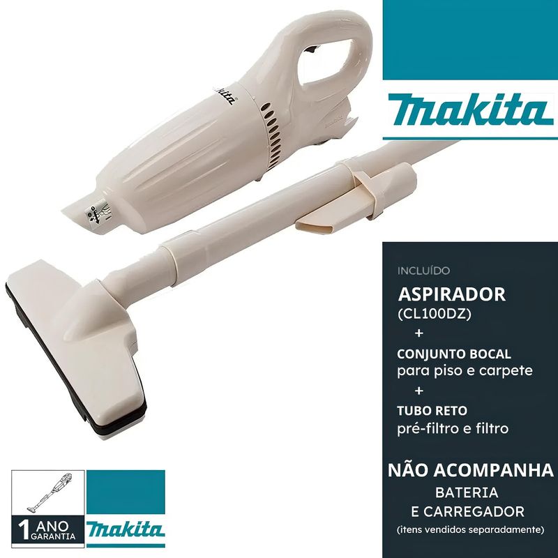 Aspirador de Pó Sem Fio Makita CL100DZ SEM BATERIA SEM CARREGADOR – Potência e Praticidade para Limpeza do Dia a DiaO Aspirador de Pó Sem Fio Makita CL100DZ é a solução ideal para quem busca facilidade e eficiência na limpeza diária, tanto em ambientes residenciais quanto comerciais. Compacto, leve e sem fio, ele oferece liberdade de movimento, permitindo que você alcance áreas de difícil acesso sem se preocupar com tomadas ou fios. O Aspirador de Pó Makita CL100DZ é perfeito para aqueles que precisam de praticidade e eficiência em limpezas rápidas. Sua mobilidade sem fio torna-o especialmente útil em residências, apartamentos, escritórios e até em ambientes comerciais de pequeno porte. Sua operação silenciosa e potência de sucção tornam o produto ideal para manter os ambientes sempre limpos e organizados sem incomodar quem está ao redor.Especificações- Sucção Máxima: 2,3 kPa- Fluxo de Ar Máximo: 1,3 m³/min- Coletor: Cápsula- Capacidade do Coletor: 600 ml- Acionamento: Gatilho- Nível de Ruído: 84 dB(A)- Peso: 0,88 kg- Dimensões (C x L x A): 45,4 x 10,3 x 15 cm- Fonte de Energia: Bateria 12VMAX Lithium Ion (vendida separadamente)- Aplicação: este aspirador serve para coletar pó seco- Potência de Sucção: 14 W- Design compacto e leve: fácil de manusear e armazenar- Bocal articulado “T”: alcança os locais mais difíceis, como embaixo de móveis- Coletor de cápsula de 600 ml: sem a necessidade de sacos descartáveis- Operação silenciosa: apenas 70 dB, ideal para ambientes sensíveisItens Inclusos- Aspirador de Pó Sem Fio Makita CL100DZ- Manual de InstruçõesNão acompanha bateria e carregadorGarantia- 12 Meses com o Fabricante