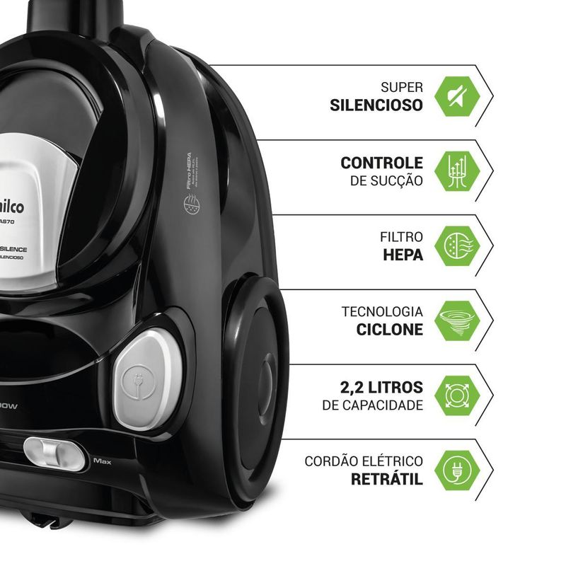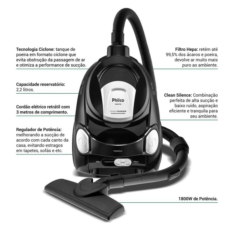 Mais agilidade na hora da limpeza com o Aspirador de Pó Philco 1800W 2,2L Super Silencioso PAS70! São 1800W de alta potência, que garante mais eficiência na hora de aspirar diferentes espaços. Aliado a 2,2L de capacidade, é possível limpar a casa toda sem precisar esvaziar o reservatório de pó com muita frequência. Equipado com a Tecnologia Clean Silence, o Aspirador de Pó Philco PAS70, tem um motor super silencioso. Ou seja, a combinação perfeita de alta sucção e baixo ruído, garantindo uma aspiração eficiente e tranquila para seu ambiente! Além disso tudo, o filtro HEPA, Retém até 99,5% dos ácaros e poeira, devolvendo um ar mais puro ao ambiente. Retrátil, o cordão elétrico de 3m facilita o manuseio do aparelho e evita as constantes trocas de tomada. Já o regulador de potência, melhora a sucção de acordo com cada canto da casa, evitando estragos em tapetes, sofás, etc. Aspirador de Pó Philco 1800W 2,2L Super Silencioso PAS70, prático e versátil, o melhor aspirador para o seu dia a dia! • Alta performance de sucção • Potência de 1800W • Capacidade do Reservatório de 2,2L • Alça para Transporte • Filtro HEPA, que retém 99% dos ácaros • Pedal Liga/Desliga • Controle eletrônico de Potência • Cordão retrátil, facilita o uso • Com compartimento transparente, facilita visualização de reservatório cheio • Rodinhas que facilitam a locomoção durante a limpeza • Acompanha acessórios para pisos • Acessório para limpeza de cantos • Acompanha acessório escova para estofados • 2 tubos prolongadores • Cordão com 3m • Motor com TCO.