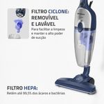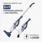 O Aspirador de Pó Turbo Cycle Hepa Mondial é a solução ideal para mais mobilidade e praticidade na limpeza diária. Aspirador 2 em 1, pode ser usado no modo portátil ou vertical, alcançando todas as áreas da casa com eficiência. Com 1.550W de potência, permite uma limpeza rápida e eficaz, ideal para quem busca desempenho sem esforço.O filtro Hepa retém ácaros, fungos e bactérias, devolvendo ao ambiente um ar mais puro, fresco e seguro. E o filtro Ciclone, com sistema de dupla filtragem, aumenta a capacidade de aspiração e mantém os filtros limpos.O coletor de pó translúcido de 1,8 litros e o cabo elétrico extra longo de 6 metros oferecem mais autonomia e maior rendimento na limpeza. Saiba mais sobre o AP-41-BLI e transforme a rotina da limpeza!2 em 1: Possui haste removível e pode ser utilizado como aspirador vertical para limpar toda a casa ou na versão portátil, para limpar estofados, teclados e carros.Potência de 1.550W: Com um potente motor e alto poder de sucção, o aspirador da Mondial possibilita uma limpeza rápida e eficiente.Filtro Hepa + Ciclone: Filtros limpos e desobstruídos para máxima eficiência de aspiração. Retem ácaros, fungos e bactérias, devolvendo ao ambiente um ar mais puro, fresco e seguro. Além disso, é removível e lavável, oferecendo praticidade no dia a dia e uma limpeza sem complicações.Máxima Mobilidade: Cabo elétrico com 6 metros sob medida para grandes áreas. Mais flexibilidade para alcançar todos os cantos da sua casa, aspirando o pó sem precisar trocar de tomada constantemente.Bocal Giro 360°: Altere a direção do aspirador de pó sem esforço e tenha uma limpeza eficiente em todos os ângulos.Pet Care: O bocal multiúso remove facilmente os pelos do seu animal de estimação.Design Moderno: O acabamento em inox confere mais sofisticação e robustez ao produto.Reservatório Translúcido de 1,8 Litros: Visualize quando o coletor estiver cheio para limpá-lo. A grande capacidade do coletor de pó possibilita maior rendimento na limpeza.Acessórios Indispensáveis: Acompanha 1 bocal multiúso, 1 bocal para estofados e 1 bocal para cantos e frestas.Porta-Fio + Porta Acessórios: Armazene seu aspirador de pó com facilidade.Para Diferentes Tipos de Piso: O aspirador Mondial limpa piso frio, carpetes, tapetes, estofados, carros, entre outros.Um Ano de Garantia Mondial: A Mondial é a escolha de milhões de consumidores. Mondial, a escolha inteligente!