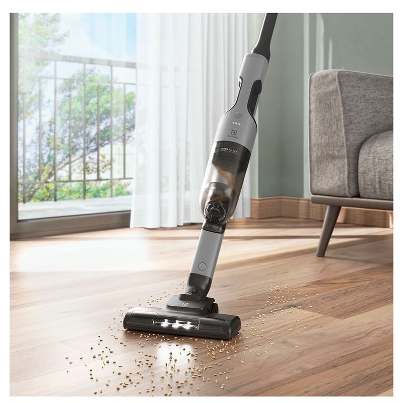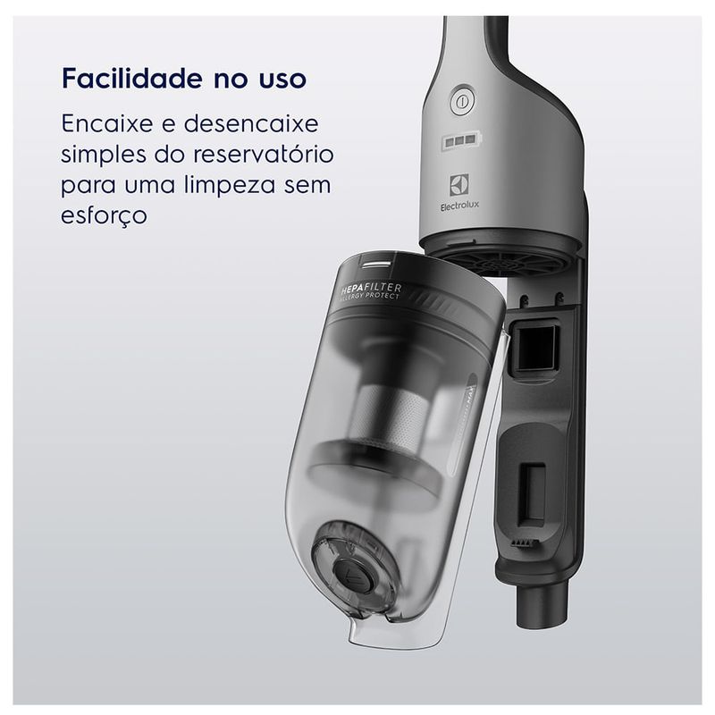Aspirador de Pó Vertical Sem Fio Electrolux Ergorapido 2 em 1 Efficient Cyclonic Power Cinza (ERG018),com limpeza eficiente e prática que alcança até espaços de difícil acesso. O Aspirador de Pó Vertical Sem Fio Electrolux Ergorapido 2 em 1 Efficient com Cyclonic Power (ERG018) proporciona uma limpeza eficiente e prática dos ambientes, já que seu formato fino e ergonômico alcança até espaços de difícil acesso. Sua tecnologia Cyclonic Power oferece alto poder de sucção, sendo capaz de filtrar o ar em etapas para reter eficientemente o pó e outras partículas e devolver ao ambiente um ar mais puro. Essa tecnologia também prolonga a durabilidade dos filtros do aspirador e os mantém eficientes por mais tempo. Conte com o design slim do bocal e uma inclinação quase total do ergorapido até o chão para uma maior liberdade de movimento; alcance áreas de difícil acesso, incluindo abaixo de móveis¹. Com a tecnologia 180° EasySteer, o bocal rotaciona para as laterais, facilitando aspirar a sujeira de todos os cantos. Sua bateria de lítio contribui com a durabilidade do produto e oferece autonomia de até 30 min, para uma limpeza eficiente. O design sem fio oferece praticidade máxima para transportar ou manusear, e o estacionamento vertical permite que você posicione o produto verticalmente sem depender de apoio. Tenha a versatilidade de um aspirador 2 em 1. O ergorapido é ideal para limpar pisos, já que o bocal com escova rotativa aspira diferentes tipos de sujeiras e sua luz de LED facilita identificar as partículas menores, como pelos, para limpar o ambiente com precisão. Já a unidade de mão portátil é perfeita para aspirar outras superfícies, como mesas. O filtro Hepa elimina micropartículas e é eficiente contra alergênicos aspirados pelo ergorapido, como fungos e ácaros. Destaques Tecnologia Cyclonic PowerFiltra o ar em etapas para reter o pó e outras partículas, devolvendo um ar mais puro ao ambiente. Prolonga a durabilidade dos filtros, mantendo sua eficiência de filtragem por mais tempo. Design slim para maior liberdade de movimentoInclinação quase total de 86° até o chão. O bocal superfino acessa áreas de difícil acesso, incluindo embaixo de móveis com espaço mínimo de 14 cm do chão. Tecnologia 180° Easy SteerRotaciona o bocal para as laterais e aspira sujeira de todos os cantos com facilidade. Bateria de lítio com autonomia de até 30 minContribui com a durabilidade do seu produto e oferece um ótimo tempo de uso para uma limpeza eficiente. Sem fio e com estacionamento verticalOferece praticidade máxima ao transportar e estaciona verticalmente sem precisar de apoios. Limpe qualquer ambiente de sua casa com mais facilidade. 2 em 1Na vertical é ideal para limpar pisos. Seu bocal com escova rotativa e luz de LED facilitam identificar e aspirar sujeiras menores, como pelos de pet. A unidade de mão portátil é perfeita para aspirar superfícies como estofados e mesas. Filtro HepaElimina micropartículas e é eficiente contra alergênicos aspirados, como fungos e ácaros. Tecnologia bagless com recipiente transparenteAspirador sem saco e com capacidade máxima de 500 ml. Fácil de limpar e esvaziar. Limpeza fácil e prática para qualquer tipo de pisoLaminado, madeira, piso frio e tapetes. Indicador de LEDAvisa quando seu ergorapido está carregando ou com carga completa. Também sinaliza a redução de carga durante o uso. Acessório inclusoAmplie sua experiência com o bocal para cantos de dupla função. Pode ser usado com a escova para ajudar a varrer a sujeira ou sem ela. CaracterísticasTipo: Aspirador de PóCapacidade: 0,95 litrosTipo de Coletor: Filtro HepaIndicador de LEDSem Fio Especificações TécnicasModelo: ERG018Potência: 90WBateria de LítioVoltagem: BivoltCor: CinzaEAN: 7909569468623Garantia: 12 meses Dimensões e PesoDimensões do Produto sem Embalagem (AxLxP): 1120x250x180 mmDimensões do Produto com Embalagem (AxLxP): 730x240x170 mmPeso do Produto sem Embalagem: 2,5 KgPeso do Produto com Embalagem: 3,1 Kg Itens Inclusos01 AspiradorBocal para cantos e frestas
