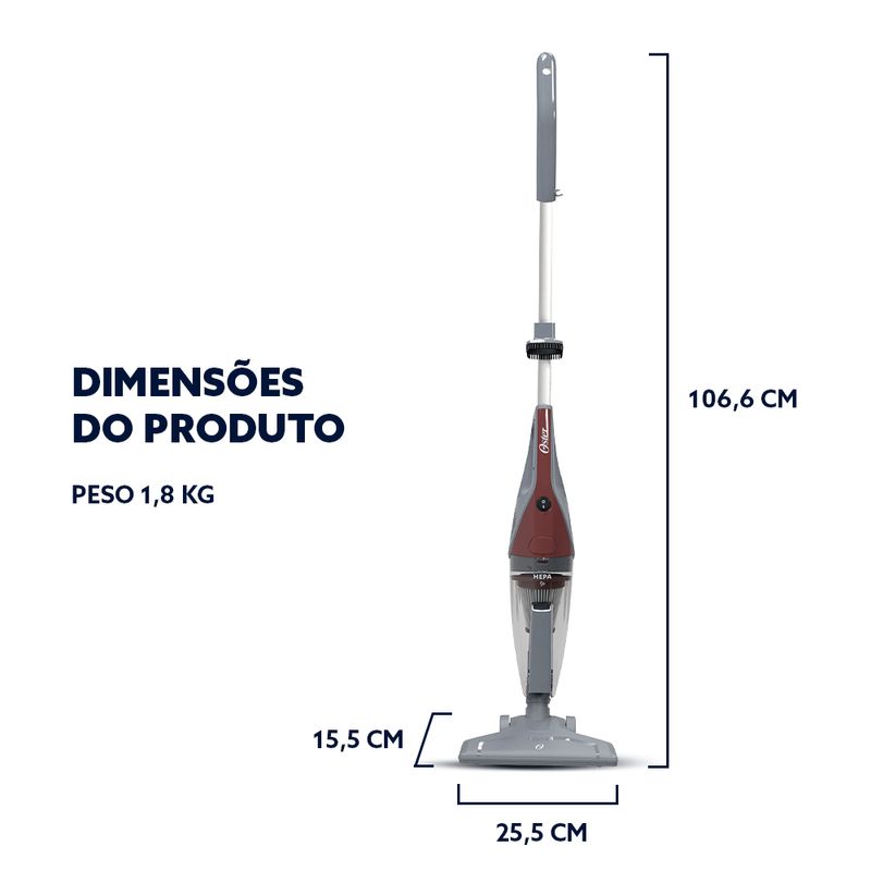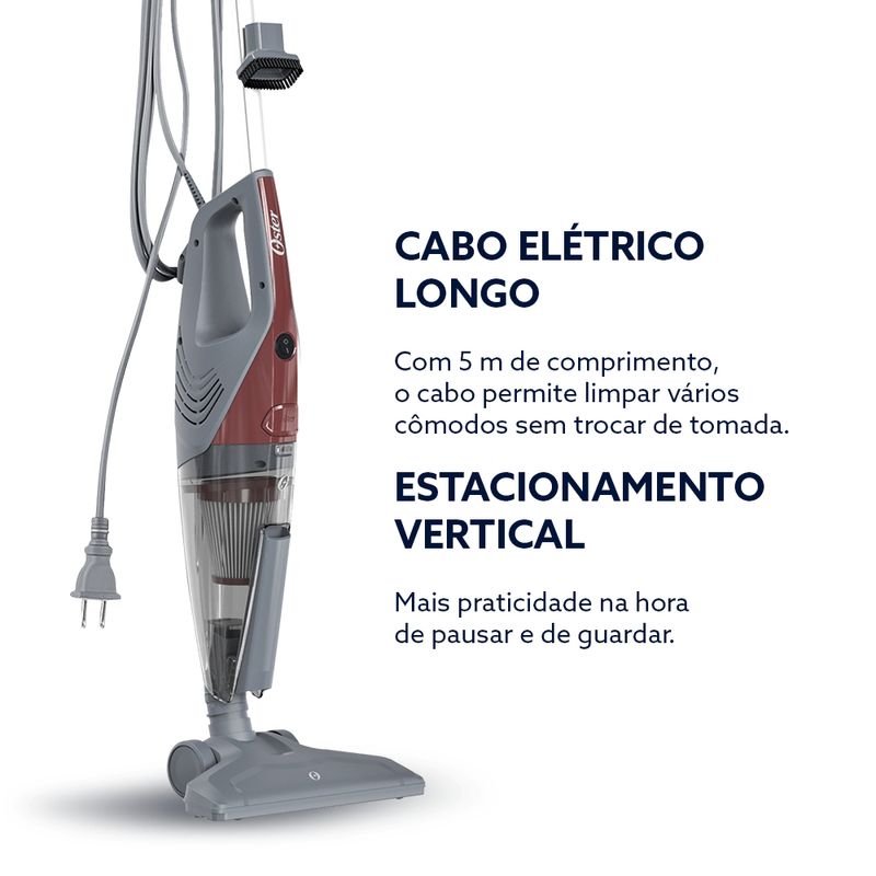 O Aspirador Stick Oster® possui design 2 em 1, sendo versátil, prático e compacto. Ideal para alcançar todos os cantos da casa, ele garante uma limpeza completa com facilidade e eficiência. - O aparelho funciona como aspirador vertical e de mão, podendo ser facilmente desacoplado para se transformar em um aspirador portátil, perfeito para acompanhar a rotina diária de limpeza. - Conta com rotação de 180° e acessórios embutidos, que permitem chegar aos cantos mais difíceis e realizar a limpeza de forma prática e rápida, sem ocupar espaço. - Com 600W de potência e sucção poderosa de 17 kPa, o Aspirador Stick Oster® oferece desempenho real para uma limpeza profunda e eficaz. Sua potência é ideal para remover sujeiras e pelos de animais, sendo uma excelente opção para casas com crianças e pets. - O reservatório de 1 litro com filtro HEPA permite limpezas completas sem interrupções e retém até 99,9% das impurezas, proporcionando um ar mais puro e saudável. - O cabo elétrico longo, com 5 metros de comprimento, oferece liberdade de movimento e possibilita limpar vários cômodos sem precisar trocar de tomada. Além disso, o aspirador conta com estacionamento vertical, que proporciona mais praticidade na hora de pausar ou guardar o aparelho. Selo de Segurança Inmetro UL