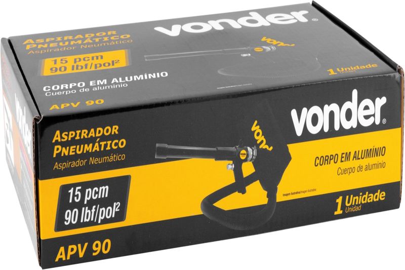 Marca: VonderConteúdo da embalagem: 1 Aspirador pneumático. Acompanha: 1 mangueira flexível, 2 abraçadeiras de metal, 3 bocais, 1 tubo extensor e 1 bolsa coletora.Destaques e diferenciais:Possui corpo em alumínio, proporcionando maior resistência e conforto durante o manuseio.Dicas de uso:Indicado para aspirar pó em geral. Utilizado com compressor de ar. Compressor indicado: 20 pcm. Utilize sempre o regulador de pressão.Detalhes Técnicos:Consumo de ar: 15 pcm Pressão de trabalho: Pressão mínima: 60 lbf/pol² / Pressão de trabalho: 90 lbf/pol² / Pressão máxima: 150 lbf/pol² Tipo de aspiração do aspirador de pó: Sólidos Capacidade da bolsa: 2 Litros Rosca de conexão: 1/4" NPT (interna - fêmea) Comprimento da mangueira.: 1,22 metros