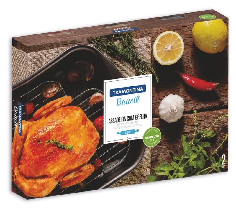 Assadeira com Grelha Tramontina Brasil em Alumínio com Revestimento Interno e Externo Antiaderente Starflon T1 Grafite 34 cm 4,9 L Com a Assadeira com Grelha Tramontina Brasil em Alumínio com Revestimento Interno e Externo Antiaderente Starflon T1 Grafite 34 cm 4,9 L suas receitas vão ganhar um toque de sabor e qualidade. Produzida em alumínio com revestimento interno e externo em antiaderente Starflon T1, que possui maior poder antiaderente e maior resistência à abrasão. Acompanha grelha em aço cromado, possibilitando um uso mais diversificado da peça. Além disso, permite cozimento uniforme dos alimentos, devido sua espessura. Na cor grafite e com 34 cm, ela pode ser utilizada em fornos a gás e elétricos. Um item prático, pode ir à máquina de lavar louças diariamente. Tenha itens Tramontina e inove na hora de cozinhar!a gás e elétrico e ir a máquina de lavar louças. Informações Gerais: Corpo de alumínio com espessura de 0,8 mm que proporciona cozimento rápido e uniforme. Revestimento interno e externo de antiaderente Starflon T1. O único com a tecnologia T: maior poder de antiaderência; maior resistência à abrasão; maior durabilidade; mais fácil para limpar e livre de PFOA, garantindo uma resistência à abrasão acima de 5.000 ciclos segundo a Norma ABNT NBR 15321:2013. Grelha em aço cromado.Pode ir à máquina de lavar louças facilitando seu dia a dia. Uso seguro e adequado:A capacidade volumétrica máxima para cozimento é de 3/4 da capacidade total da peça. Ao manusear o utensílio quente, tenha cuidado redobrado, utilize proteções para as mãos e mantenha fora do alcance das crianças. Este produto não pode sofrer modificações. Antes do primeiro uso, lave com esponja macia, sabão neutro ou detergente líquido. Depois de secar, unte a área interna com óleo ou gordura e leve ao forno pré-aquecido por dois minutos. Deixe esfriar e lave novamente. Seu utensílio Starflon está pronto para uso com ou sem gordura, sempre em fogo baixo ou médio (nunca superior a 350ºC).Para mexer os alimentos use somente utensílios de silicone, nylon ou madeira. Evite a imersão do utensílio quente em água fria. Nunca utilize produtos abrasivos na lavagem. Se deixar queimar alimentos, umedeça a área e reserve até que possa remover os resíduos grudados com esponja e sabão. Para descarte dos produtos e embalagens siga as orientações de reciclagem vigentes. Este produto não necessita de manutenção, apenas limpeza. Garantia: 90 dias de garantia legal para vícios ou defeitos de fabricação.Produto com certificação compulsória certificada pelo SGS 0040, registro 003660/2018, modelo assadeira e classificação de antiaderência A (ótima), conforme portaria INMETRO 419/2012.
