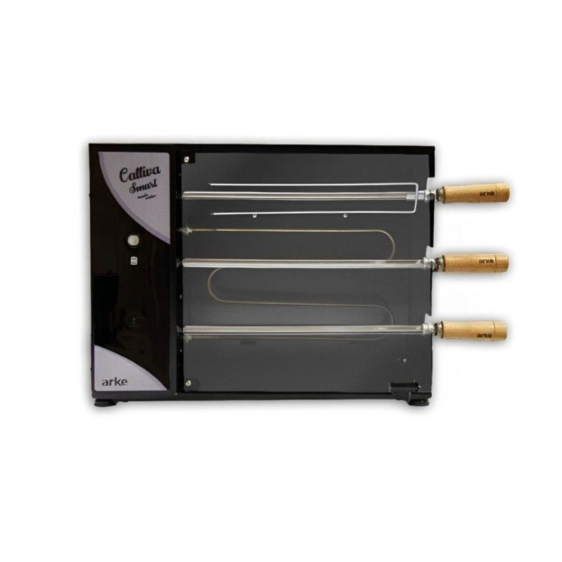 Assador Elétrico Rotativo 3 Espetos Cattiva Smart ArkeAssador Elétrico Rotativo 3 Espetos Cattiva Smart ArkePintura epóxi: Melhor proteção e acabamento. O produto fica por muito mais tempo, é mais resistente e fácil de limpar.Vidro reto que facilita a limpeza.Garante melhor da temperatura no interior do assador e um assado mais uniforme.Sistema de rotação de espetos: Permite assar de forma homogênea todos os tipos de carne. Seu alimento fica muito mais saboroso.Porta de vidro transparente: Melhor visualização e acompanhamento do preparo do alimento.Pés antiderrapantes: Estabilidade e no uso do produto.Ecologicamente correto: Não produz fumaça. Assa seu churrasco sem prejudicar o meio ambienteAcompanha bandeja coletora de gordura: Seu alimento fica ainda mais saudável, além de facilitar a limpeza.Acompanha 3 espetos: 2 simples e 1 triplo.Produto certificado conforme portaria 148/2022 e 200/2021 do INMETRO.Voltagem: 110 / 220 VMedidas: 39 × 61,5 × 51,5 cmPeso: 15,58 kg