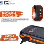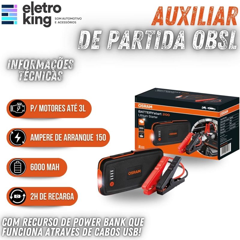 Seja bem-vindo a Eletroking, leia atentamente a descrição do produto abaixo antes da compra, qualquer dúvida, nos acione no campo de perguntas do anúncio. Auxiliar De Partida Power Bank Osram Batterystart 200 OBSL200 Com LED Auxiliar - 6000mAH Tenha segurança e praticidade sempre à mão com o Auxiliar de Partida Power Bank Osram BATTERYstart200. Compacto, leve e eficiente, ele oferece 6000mAh de potência para dar partida em veículos 12V com motores de até 3.0L, além de funcionar como power bank, permitindo carregar celulares e outros dispositivos eletrônicos via USB. Especificações Técnicas: • Voltagem: 12V • Capacidade de Bateria: 6.000mAH • Tempo de carregamento: 2 horas • Número de portas USB: 1 porta • Amperes de Arranque: 150 • Amperes de pico: 500 Conteúdo da Embalagem: • Auxiliar de Partida OBSL200 • Cabo auxiliar de Partida • Cabo USB Importante: • Garantia de 273 dias. • Valor Unitário. • Todos os Nossos Produtos São Novos, Originais e Acompanham Nota Fiscal. • A Eletroking recomenda que a instalação seja feita por profissional especializado e não se responsabiliza pelo mau uso do produto.