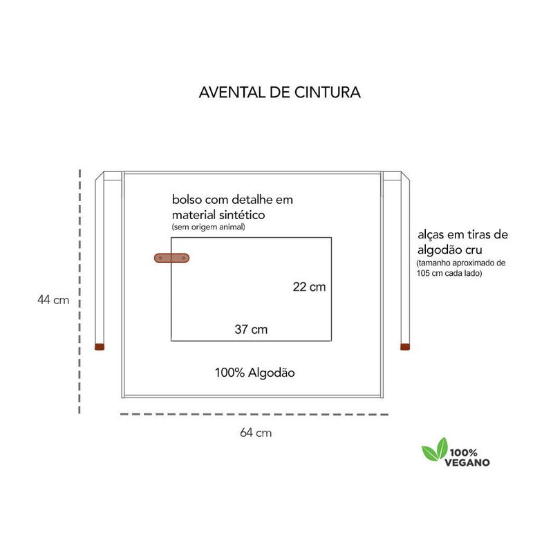Avental de cintura de algodao. Ajustavel na cintura, atraves das tiras para amarrar e bolso frontal. Ideal para chef de cozinha, barista, jardinagem, pintura e outros. Este avental é pratico, basico, veste bem e fácil de lavar. O avental profissional da CASACHA atende bem aos clientes mais exigentes priorizando conforto, qualidade e estilo. O material sintetico não é proveniente de origem animal. Contem: 1 Faixa de Cabelo Tamanho: Unico 1 Avental Meio Corpo Tamanho: 64 x 44 cm Material: 100% Algodao