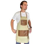 Avental feito especialmente para fazer sucesso. Robusto e diferenciado. Junto com seu prazer em fazer churrasco, vocês farão sucesso. Atenção para os detalhes: um porta faca em couro, uma bolsa em couro e um argola para pendurar toalhas ou luvas. Rebites cobre. Unissex, tamanho Único 74 cm x 57 cm Material: Couro Legitimo e Lona Marca: Utensilios do Chef