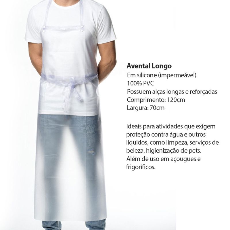 Avental impermeavel longo e transparente, produzido em silicone. O avental impermeavel é perfeito para açougueiro, farmacia, laboratorio, faxina de ambientes, limpeza de veiculos, higienizaçao de pets e salao de beleza. Os aventais longos possuem alças longas e reforçadas, sao resistentes e por serem impermeaveis sao ideais para atividades que exijam proteçao leve contra agua e outros liquidos. 1 Avental Longo Medidas: 120 x 70 cm Material: 100% PVC