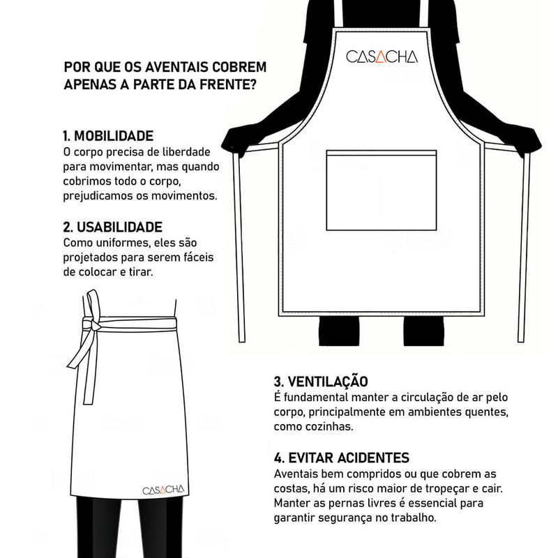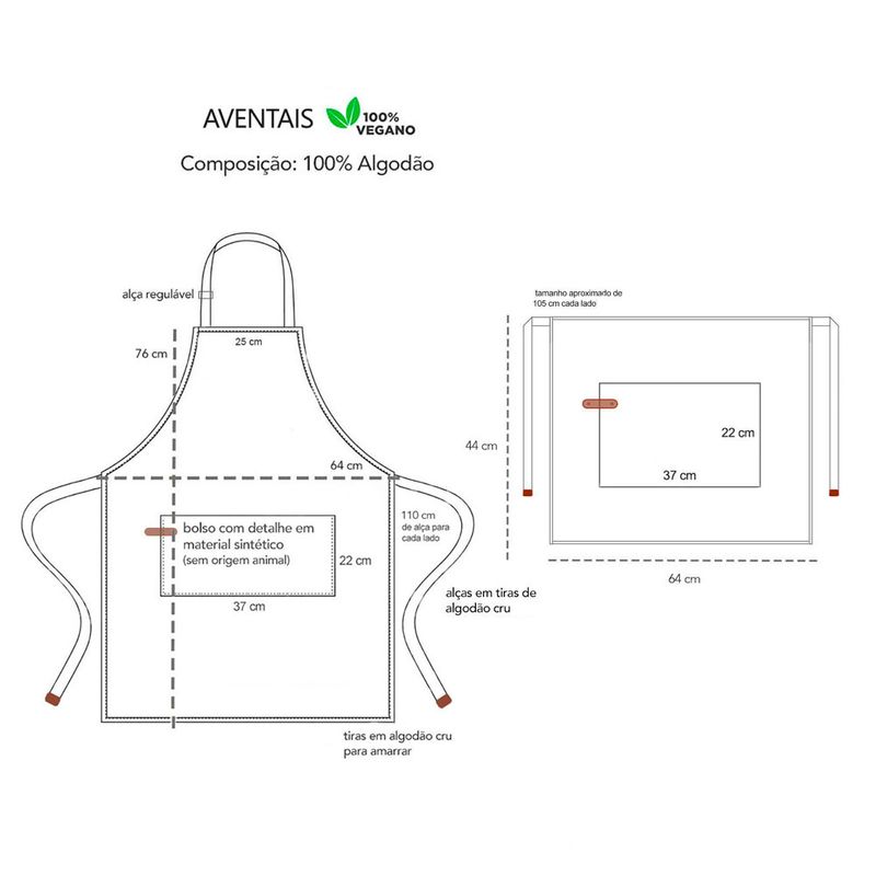 Jogo de aventais profissionais de algodao. Ajustavel na cintura, atraves das tiras para amarrar e bolso frontal. Ideal para chef de cozinha, barista, jardinagem, pintura e outros. Este avental é pratico, basico, veste bem e facil de lavar. O avental profissional da CASACHA atende bem aos clientes mais exigentes priorizando conforto, qualidade e estilo. O material sintetico não é proveniente de origem animal. Contem: 1 Avental de Cintura Tamanho: 64 x 44 cm 1 Avental Corpo Inteiro Tamanho: 76 x 64 cm Material: 100% Algodao