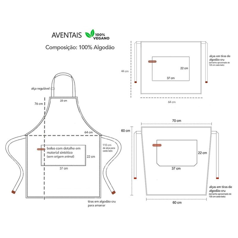 Jogo de aventais profissionais de algodao. Ajustavel na cintura, atraves das tiras para amarrar e bolso frontal. Ideal para chef de cozinha, barista, jardinagem, pintura e outros. Este avental é pratico, basico, veste bem e facil de lavar. O avental profissional da CASACHA atende bem aos clientes mais exigentes priorizando conforto, qualidade e estilo. O material sintetico não é proveniente de origem animal. Contem: 1 Avental de Cintura P Tamanho: 64 x 44 cm 1 Avental de Cintura M Tamanho: 70 x 60 cm 1 Avental Corpo Inteiro Tamanho: 76 x 64 cm Material: 100% Algodao