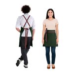 Jogo de aventais profissionais de algodao. Ajustavel na cintura, atraves das tiras para amarrar e bolso frontal. Ideal para chef de cozinha, barista, jardinagem, pintura e outros. Este avental é pratico, basico, veste bem e facil de lavar. O avental profissional da CASACHA atende bem aos clientes mais exigentes priorizando conforto, qualidade e estilo. O material sintetico não é proveniente de origem animal. Contem: 1 Avental Corpo Inteiro Tamanho: 76 x 66 cm 1 Avental de Cintura Curto Tamanho: 64 x 44 cm Material: 100% Algodao