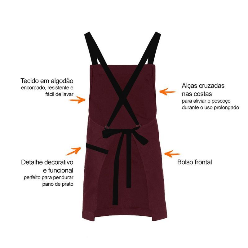 Avental corpo inteiro com alças cruzadas nas costas e bolso frontal. Este modelo de avental com alças cruzadas é ideal para aliviar o pescoço durante o uso prolongado. Possui detalhe decorativo e funcional ao lado do bolso, perfeito para pendurar pano de prato. Feito para chef de cozinha, barista, jardinagem, pintura e outros. Este avental atende bem aos clientes mais exigentes priorizando conforto, qualidade e estilo. Produzido em tecido 100% algodao, facil de lavar e indicado para uso na maquina de lavar roupa. Contem: 1 Avental Unissex Tamanho: 76 x 66 cm Material: 100% Algodao CASACHA especializada em aventais e jogos americanos profissionais