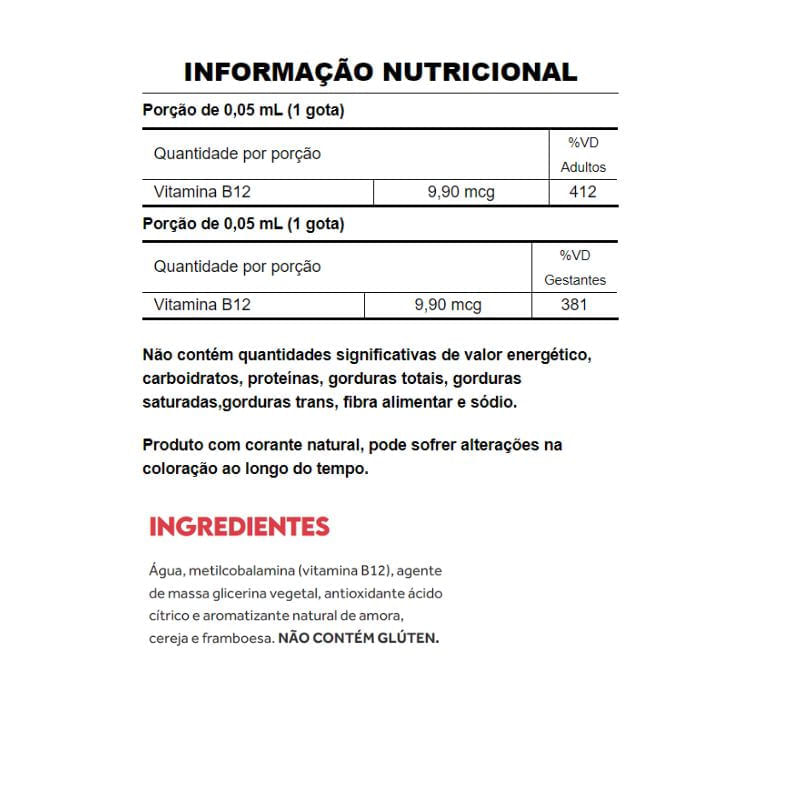 B12 Drops 20ml Puravida A B12 drops Puravida, é um suplemento alimentar de vitamina B12, em sua forma ativa, metilcobalamina, que possui melhor absorção, em gotas com sabor natural de frutas vermelhas. Sobre o ingrediente: Vitamina B12: é uma vitamina importante para o metabolismo energético, além de contribuir para o sistema imunológico e prevenção de anemias. Sugestão de consumo: Adultos acima de 19 anos e gestantes: consumir 1 gota ao dia ou conforme recomendação do médico ou nutricionista. Agite antes de beber. Motivos para escolher o produto: ● 1 gota possui 9,90mcg de Vitamina B12; ● Na forma de metilcobalamina, em sua forma biodisponível, possui melhor absorção; ● Vegano; ● Sem corantes, conservantes e aromatizantes artificiais; ● Sem glúten. A Marca Puravida é uma empresa que nasceu com o propósito de facilitar a prática de um estilo de vida orgânico. Acreditam que a qualidade daquilo que escolhemos comer, pode afetar o funcionamento do nosso corpo, funcionamento dos órgãos, humor, foco e mente. Através de suas vitaminas, suplementos, cosméticos, granolas, colágenos e outros produtos elaborados com ingredientes de altíssima qualidade podem contribuir com a sinergia do corpo.