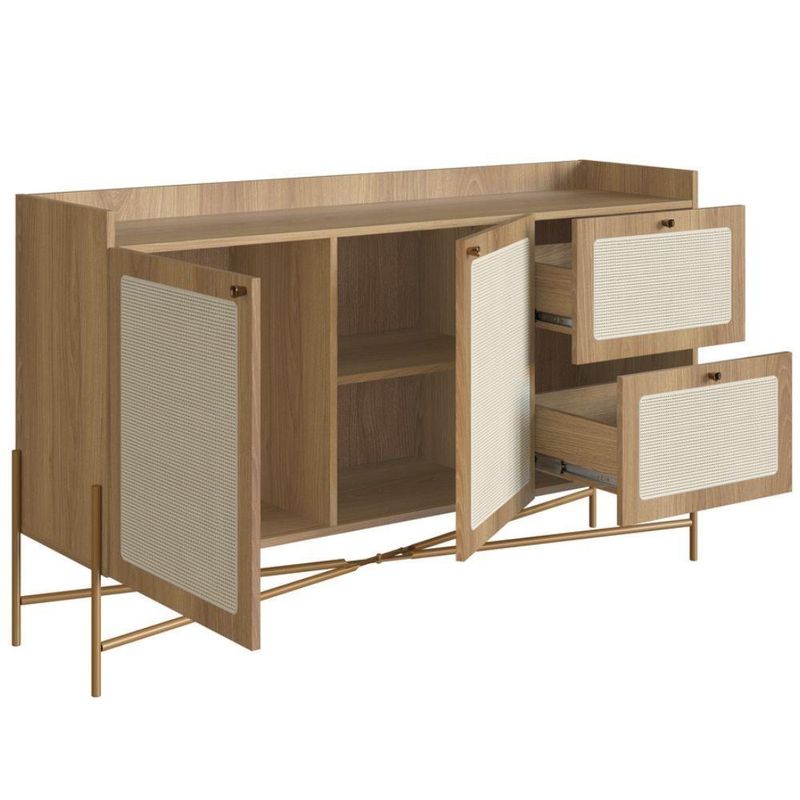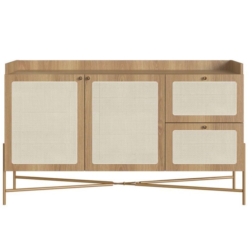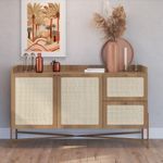 Balcão Buffet 139cm Pés Metálicos Oslo - HanoverO Balcão Buffet Oslo é uma peça sofisticada de 139cm que redefine o armazenamento para salas de estar e jantar. Ele combina a funcionalidade robusta com um design escandinavo minimalista, acentuado pelo toque contemporâneo dos pés metálicos.A estrutura principal do buffet é solidamente confeccionada em MDP com acabamento BP, um material durável que apresenta um acabamento que imita madeira clara. A peça é elevada por elegantes pés metálicos de design arrojado, que conferem estabilidade e um contraste moderno e industrial com o corpo do móvel.O charme visual e o traço artesanal da peça são inegáveis, graças ao aplique de tela sintética nas gavetas e portas, imitando a palhinha natural. Este detalhe texturizado suaviza a estrutura e adiciona um toque orgânico.Em termos de organização, o buffet é altamente funcional, oferecendo uma solução completa:Duas portas centrais que dão acesso a nichos internos com prateleira, ideais para guardar louças e objetos maiores.Duas gavetas laterais, perfeitas para organizar talheres, jogos americanos ou acessórios menores.Este balcão buffet é a escolha ideal para quem busca uma peça de destaque que alie a funcionalidade de nichos internos e gavetas com um design que mescla tendências de forma harmoniosa.Garanta seu Balcão Buffet agora mesmo em nosso site!Especificações:Altura: 81cmLargura: 139cmProfundidade: 38cmNecessita montagem: simGarantia: 90 dias contra defeitos de fabricação.Limpeza e Manutenção:Limpar com pano macio umedecido em solução de água e sabão neutro e secar em seguida;Não utilizar produtos químicos. Não expor seu produto ao sol e umidadeNão exceder o limite de peso.