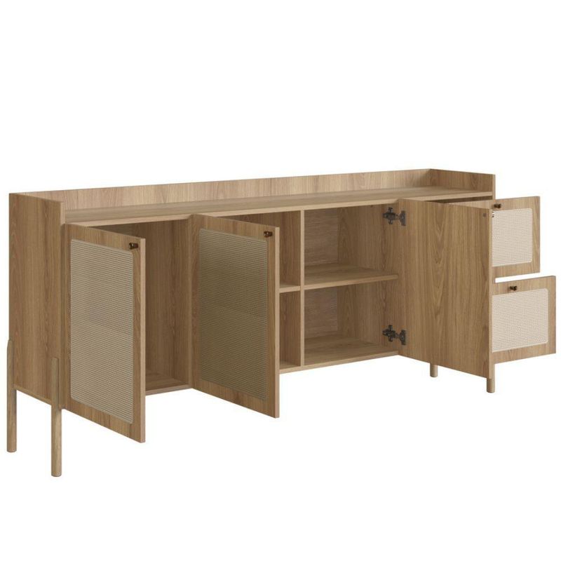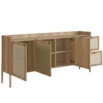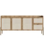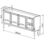 Balcão Buffet 183cm Com Pés De Madeira Oslo - HanoverO Balcão Buffet Oslo de 183cm é uma peça imponente, pensada para salas de jantar ou estar que necessitam de um móvel com grande capacidade de armazenamento e um apelo estético marcante. Seu visual se alinha ao design escandinavo minimalista, unindo funcionalidade e elegância orgânica na madeira clara.A estrutura do buffet é robusta e durável, sendo confeccionada em MDP com acabamento BP, garantindo a longevidade da superfície. A peça é elegantemente elevada por pés de madeira maciça cilíndricos, que conferem um acabamento natural e premium ao balcão.O elemento de maior destaque e sofisticação é o aplique de tela sintética nas gavetas e portas, que imita o charme da palhinha natural. Este detalhe texturizado confere um marcante traço artesanal ao buffet, suavizando suas dimensões e enriquecendo o design.Em termos de organização, o balcão é extremamente completo para o armazenamento de louças e utensílios:Possui três portas centrais que dão acesso a amplos nichos internos com prateleiras, ideais para itens maiores e de maior volume.Conta com duas gavetas laterais, perfeitas para organizar talheres, jogos americanos e acessórios de mesa com maior precisão.Com seu design escandinavo minimalista e o detalhe artesanal, este buffet de 183cm é a solução perfeita para quem busca um móvel de grande porte que ofereça tanto funcionalidade quanto um estilo inconfundível.Garanta seu Balcão Buffet agora mesmo em nosso site!Especificações:Altura: 81cmLargura: 183cmProfundidade: 38cmNecessita montagem: simGarantia: 90 dias contra defeitos de fabricação.Limpeza e Manutenção:Limpar com pano macio umedecido em solução de água e sabão neutro e secar em seguida;Não utilizar produtos químicos. Não expor seu produto ao sol e umidadeNão exceder o limite de peso.