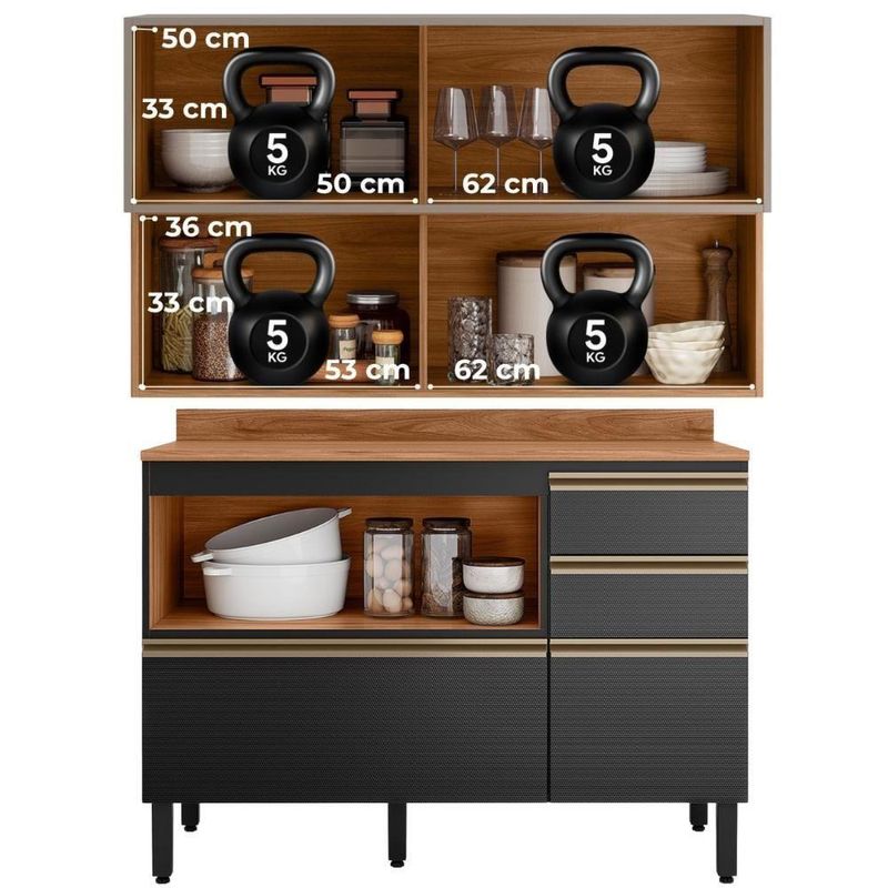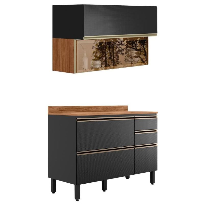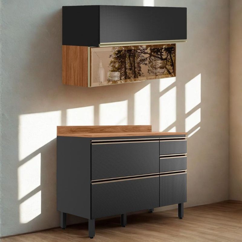 Balcao Com Tampo E Armario Aereo Vidro 120 Cm Proenca Nogueira Carbono Prime Demartez Nogueira Carbono PrimeSofisticado e funcional, o Conjunto Balcão e Armário Proença foi pensado para otimizar o espaço com elegância. Produzidos 100% em MDF (20 e 15 mm) com acabamento em pintura UV. Conta com portas basculantes com pistão a gás e dobradiças metálicas de 35 mm (sendo uma com vidro Reflecta de 3 mm), gavetas laterais (uma com divisor de talheres) e gavetão inferior, equipadas com corrediças telescópicas, pés com regulagem de altura, puxadores em alumínio e tampo em MDF 20mm. Este produto será entregue em 04 volumes.DimensõesBalcão D9140BTAltura: 93 cmLargura: 120 cmProfundidade: 52 cm Armário D9212Altura: 72 cmLargura: 120 cmProfundidade: 52 cm Especificações TécnicasModelo: D9140BT/D9212Materiais: MDF.Estilo: ModernoAmbiente: CozinhaPeso máximo suportado: 85kg distribuídos. Sistema de montagemParafuso, pregos, cavilhas.Manual de montagem incluso.Montagem, desmontagem e outras instalações serão de responsabilidade do cliente! Recomendação de LimpezaPara a limpeza, utilize um pano seco para retirada do pó.Evite o uso de produtos abrasivos e o contato direto com a umidade. Beleza e resistência para completar sua cozinha com praticidade. Importante SaberAs imagens são meramente ilustrativas, não acompanham objetos de decoração e eletrônicos.A tonalidade da cor do produto pode variar de acordo com a calibração de cores do seu monitor, a iluminação do ambiente ou sua percepção visual.O cliente deve verificar a quantidade de VOLUMES descritos na nota, a situação da embalagem, caso haja algum dano NÃO ASSINE o comprovante de recebimento e RECUSE a mercadoria.Não nos responsabilizamos por subir escadas/elevadores ou pelo transporte por guincho em apartamentos. Eventuais despesas são de responsabilidade do comprador.Confira as dimensões do produto e certifique-se de que passarão normalmente por elevadores, portas, escadas ou corredores de sua residência.Recomendamos que o responsável pelo recebimento confira se os produtos entregues correspondem ao modelo e à quantidade adquirida.Garantia De Fábrica90 dias para eventuais defeitos de fabricação. NA | Cor: Nogueira Carbono Prime