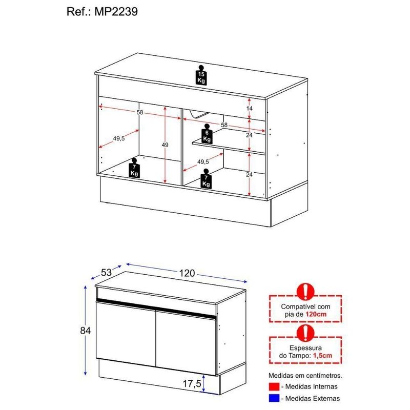 O Balcão Cozinha Gabinete Pia 120cm 2 Portas com Rodapé Veneza é a solução perfeita para a sua cozinha. Produzido em MDP com acabamento acetinado (cerca de 20% de brilho), oferece um amplo espaço interno e um compartimento especial para utensílios altos. Seus puxadores em ABS garantem durabilidade e facilidade no manuseio, enquanto os rodapés agregam elegância ao móvel. O balcão acompanha tampo removível, com pia de 120cm. O tampo em MDP de 15mm possui pintura de alta resistência, assegurando longa vida útil ao produto.Conteúdo da Embalagem:1 (um) Balcão com tampo 120cmKit FerragemManual de MontagemDimensões do produto montado:Altura: 84cm | Largura: 120cm | Profundidade: 53cm (balcão com tampo)*Consulte as medidas detalhadas na imagem técnica do produto.*As cores do produto podem variar de acordo com as configurações do seu dispositivo.Imagem meramente ilustrativa. Decoração não acompanha o produto.O produto será entregue desmontado e não disponibilizamos o serviços de montagem.