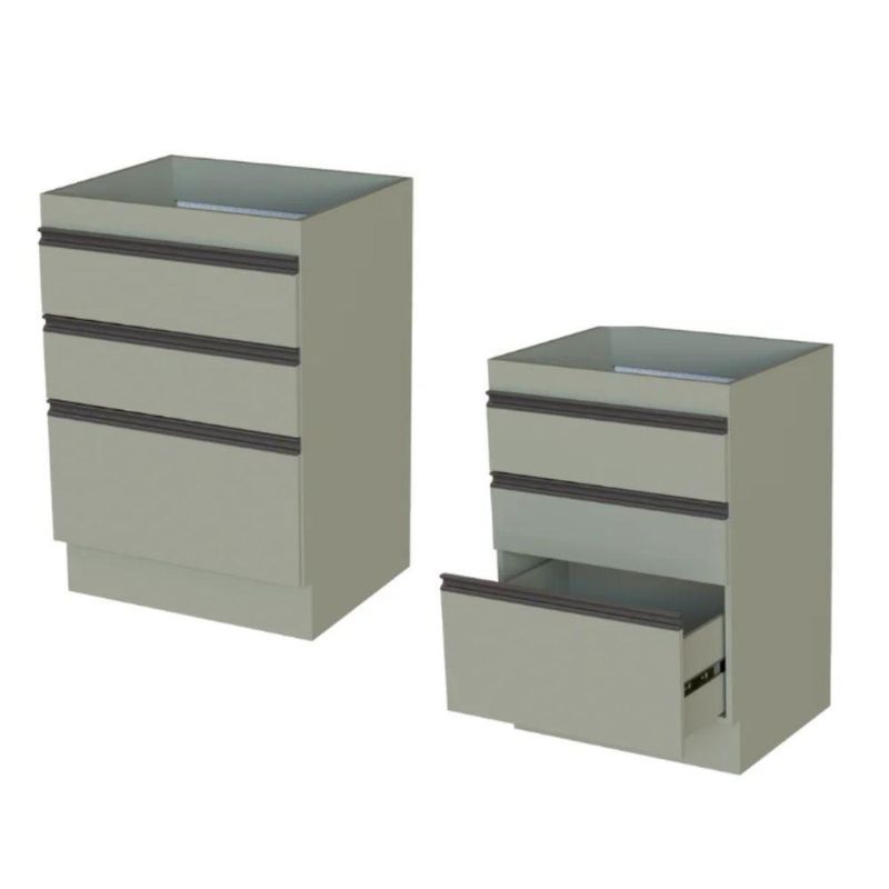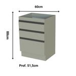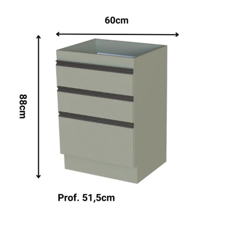 Balcão Da Casa 600mm 3g CordaO Balcão de Cozinha 60 cm com 3 Gavetas Planejado Funcional é a solução ideal para quem busca organização, praticidade e design moderno em cozinhas compactas ou planejadas. Com estrutura resistente e layout inteligente, oferece excelente aproveitamento interno com três gavetas, sendo duas gavetas estreitas e um gavetão, ideal para utensílios, mantimentos e itens do dia a dia. A primeira gaveta conta com separador de talheres, garantindo ainda mais organização e praticidade no uso diário.Fabricado em MDP de 1,5 cm de espessura, o balcão garante durabilidade, estabilidade e segurança. As gavetas possuem corrediças telescópicas de abertura total, proporcionando deslizamento suave e silencioso, oferecendo conforto e facilidade no manuseio. O perfil puxador em alumínio, com ponteiras em ABS, adiciona um visual moderno e sofisticado ao móvel.O produto acompanha cantoneiras metálicas e parafusos para fixação do tampo superior (vendido separadamente). Para maior resistência estrutural, o tampo inferior é fixado abaixo das laterais, garantindo mais estabilidade e durabilidade. Todos os padrões recebem sete camadas de pintura UV, oferecendo acabamento uniforme, resistente e proteção contra desgastes do uso diário.Onde UsarCozinhas planejadas ou compactasÁreas de dispensa que necessitam de organização funcionalAmbientes que exigem otimização de espaço, praticidade e versatilidadeCuidados e LimpezaLimpar com pano levemente umedecido e finalizar com pano secoEvitar produtos abrasivos ou solventes químicosGarantir instalação correta para maior segurança e durabilidade do balcãoDestaquesEstrutura em MDP de 1,5 cm resistente e durável3 gavetas: 2 estreitas e 1 gavetão, com separador de talheres na primeiraCorrediças telescópicas de abertura total, suaves e silenciosasPerfil puxador em alumínio com ponteiras em ABSFixação segura com cantoneiras metálicas e parafusosTampo inferior fixado abaixo das laterais para maior resistênciaPintura UV com 7 camadas, acabamento durável e sofisticadoDesign moderno, funcional e elegante para qualquer cozinhaFicha TécnicaMaterial: MDPEspessura do material: 1,5 cmAltura: 88 cmLargura: 60 cmProfundidade: 51,5 cmQuantidade de gavetas: 3Tipo de gavetas: 2 gavetas estreitas e 1 gavetãoCorrediças: Telescópicas de abertura totalSeparador de talheres: Sim (na primeira gaveta)Puxador: Perfil em alumínio com ponteiras em ABSTampo superior: Vendido separadamenteFixação: Cantoneiras metálicas e parafusosAcabamento: Pintura UV com 7 camadasTipo de móveis de cozinha: Balcão | Requer montagem: Sim | Cor: Corda