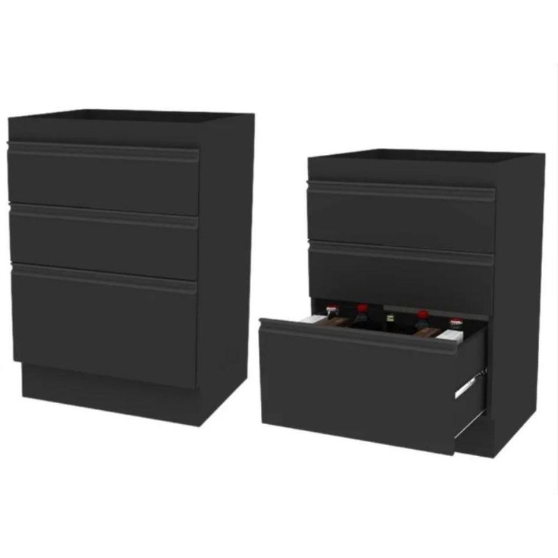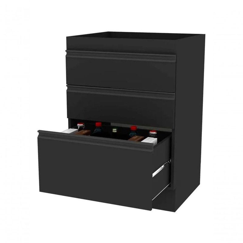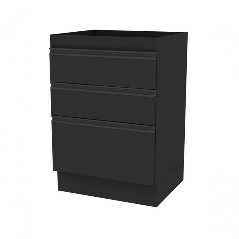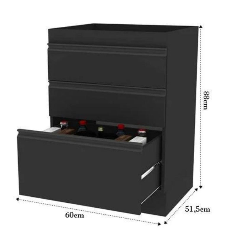 Balcão Da Casa 600mm 3g OnixO Balcão de Cozinha 60 cm com 3 Gavetas Planejado Funcional é a solução ideal para quem busca organização, praticidade e design moderno em cozinhas compactas ou planejadas. Com estrutura resistente e layout inteligente, oferece excelente aproveitamento interno com três gavetas, sendo duas gavetas estreitas e um gavetão, ideal para utensílios, mantimentos e itens do dia a dia. A primeira gaveta conta com separador de talheres, garantindo ainda mais organização e praticidade no uso diário.Fabricado em MDP de 1,5 cm de espessura, o balcão garante durabilidade, estabilidade e segurança. As gavetas possuem corrediças telescópicas de abertura total, proporcionando deslizamento suave e silencioso, oferecendo conforto e facilidade no manuseio. O perfil puxador em alumínio, com ponteiras em ABS, adiciona um visual moderno e sofisticado ao móvel.O produto acompanha cantoneiras metálicas e parafusos para fixação do tampo superior (vendido separadamente). Para maior resistência estrutural, o tampo inferior é fixado abaixo das laterais, garantindo mais estabilidade e durabilidade. Todos os padrões recebem sete camadas de pintura UV, oferecendo acabamento uniforme, resistente e proteção contra desgastes do uso diário.Onde UsarCozinhas planejadas ou compactasÁreas de dispensa que necessitam de organização funcionalAmbientes que exigem otimização de espaço, praticidade e versatilidadeCuidados e LimpezaLimpar com pano levemente umedecido e finalizar com pano secoEvitar produtos abrasivos ou solventes químicosGarantir instalação correta para maior segurança e durabilidade do balcãoDestaquesEstrutura em MDP de 1,5 cm resistente e durável3 gavetas: 2 estreitas e 1 gavetão, com separador de talheres na primeiraCorrediças telescópicas de abertura total, suaves e silenciosasPerfil puxador em alumínio com ponteiras em ABSFixação segura com cantoneiras metálicas e parafusosTampo inferior fixado abaixo das laterais para maior resistênciaPintura UV com 7 camadas, acabamento durável e sofisticadoDesign moderno, funcional e elegante para qualquer cozinhaFicha TécnicaMaterial: MDPEspessura do material: 1,5 cmAltura: 88 cmLargura: 60 cmProfundidade: 51,5 cmQuantidade de gavetas: 3Tipo de gavetas: 2 gavetas estreitas e 1 gavetãoCorrediças: Telescópicas de abertura totalSeparador de talheres: Sim (na primeira gaveta)Puxador: Perfil em alumínio com ponteiras em ABSTampo superior: Vendido separadamenteFixação: Cantoneiras metálicas e parafusosAcabamento: Pintura UV com 7 camadasTipo de móveis de cozinha: Balcão | Requer montagem: Sim | Cor: Onix