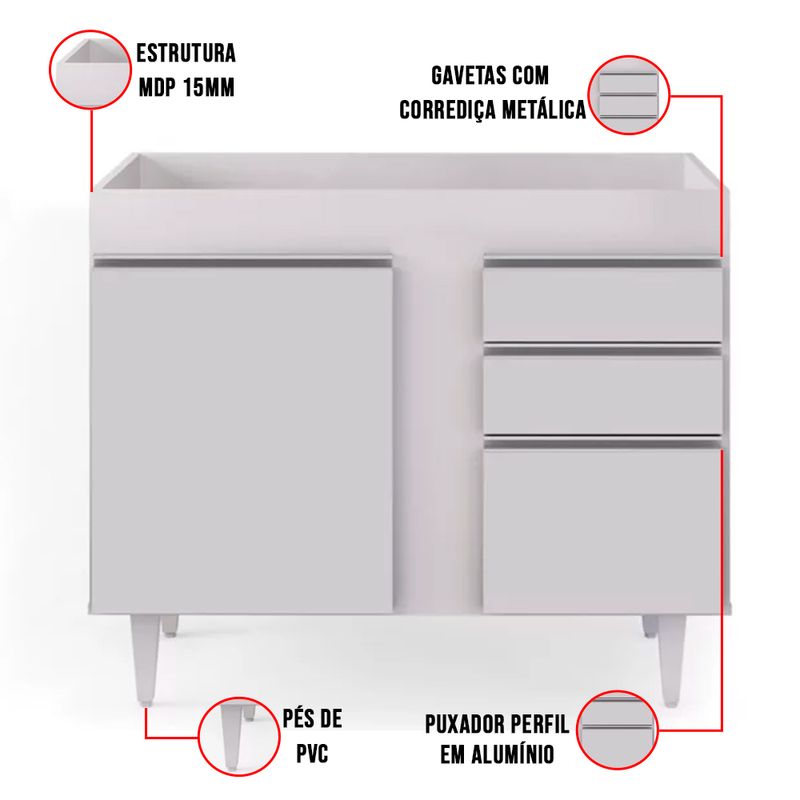 Está pensando em renovar os móveis da sua cozinha! Por ser um ambiente muito frequentado da casa, realmente esses móveis se desgastam muito rápido e perdem um pouco de utilidade. E por algum certo tipo de apego ou acomodação você não teve tempo e coragem de trocá-los, não é!? Então, conte com a gente para te ajudar a transformar esse ambiente, em um lugar que sempre sonhou, e tudo isso sem sair do conforto do seu lar! Para não ter erro, você pode apostar sem medo neste lindo Balcão com Tampo e Armário Aéreo Aurora 100 cm no tom Branco e Preto. Um conjunto feito para durar muito tempo! Foi produzido com os melhores materiais, o armário possui 2 portas de puxadores em perfil alumínio e ainda conta com 1 prateleira interna oferecendo maior organização. Por ser um armário aéreo, você pode fixá-lo de acordo com a sua altura e necessidade. Já o balcão, é uma ótima opção para tornar seu espaço ainda mais harmônico e sofisticado. Com estrutura em MDP acompanha tampo, possui 2 portas, 2 gavetas de puxadores em perfil alumínio e ainda conta com 1 prateleira interna para guardar várias coisas. Além desse móvel ter um espaço interno ideal para guardar seus utensílios, com ele você melhora sua agilidade na cozinha e ainda consegue manter a bancada sempre organizada. Não perca mais tempo, use essa tendência no seu lar! Escolha o seu. Dimensões Armário Aéreo Altura total: 54 cm Largura total: 100 cm Profundidade total: 29 cm Peso: 16 kg Dimensões Balcão Altura total: 82 cm Largura total: 100 cm Profundidade total: 50 cm Peso: 31 kg Especificações do Produto Material Estrutura: MDP 15 mm. Acabamento: Pintura BP. Escala de Brilho: Fosco. Peso suportado: Até 30 kg. Possui Prateleiras: Sim, 2 Prateleiras. Possui Portas: Sim, 4 Portas. Tipo de Porta: Convencional. Possui Gavetas: Sim, 2 Gavetas Possui Nichos: Sim, Tampo de MDP 15 mm, 100 x 8,5 x 50 cm Possui Puxador: Sim, Alumínio. Possui Tampo: Não. Possui Pés: Sim, PVC com Regulagem Cor: Branco Garantia: 90 dias contra defeito de fabricação. Necessita Montagem: Sim. Complexidade da Montagem: Média: Deve ser montado por um montador especializado. Instruções de limpeza: Para maior durabilidade do produto, recomendamos mantê-lo longe de umidade e poeira e da exposição direta a luz solar. A limpeza deve ser feita usando um pano macio e semi úmido, sem o uso de produtos químicos como álcool ou Lustra Móveis. Ao precisar movimentar o móvel, evite arrasta-lo ou levanta-lo sozinho, peça ajuda a outra pessoa para realizar a tarefa. Você irá receber: 03 Volumes com 01 Armário Aéreo, 01 Balcão e 01 Tampo Observações Relevantes - Todos os produtos vão embalados com total segurança; - As cores dos produtos podem sofrer alterações dependendo do seu monitor; - Para futuras compras, não garantimos a mesma tonalidade de cor, pois existe variação a cada lote do fabricante do tecido; - As imagens são meramente ilustrativas, não acompanham objetos de decoração e eletros; - Confira as dimensões do produto no momento da compra e certifique-se de que passará normalmente por escadas, elevadores, portas e corredores; - Importante: Por se tratar de estofado as medidas podem ter uma pequena variação em até 3 cm; - Não nos responsabilizamos no ato da entrega por montagens, desmontagens, instalações de produtos; - Não nos responsabilizamos no ato da entrega por subir escadas, elevadores, nem utilização de guinchos ou equipamentos similares para acesso a pisos superiores em apartamentos; - A entrega do produto é realizada em todo território nacional, até onde as rodovias alcançam, entregas fluviais ou aéreas devem ser cotadas a parte; - Observando as orientações acima, evita-se futuros desagrados ou imprevistos com a entrega do produto. Havendo despesas adicionais, serão de responsabilidade do cliente;