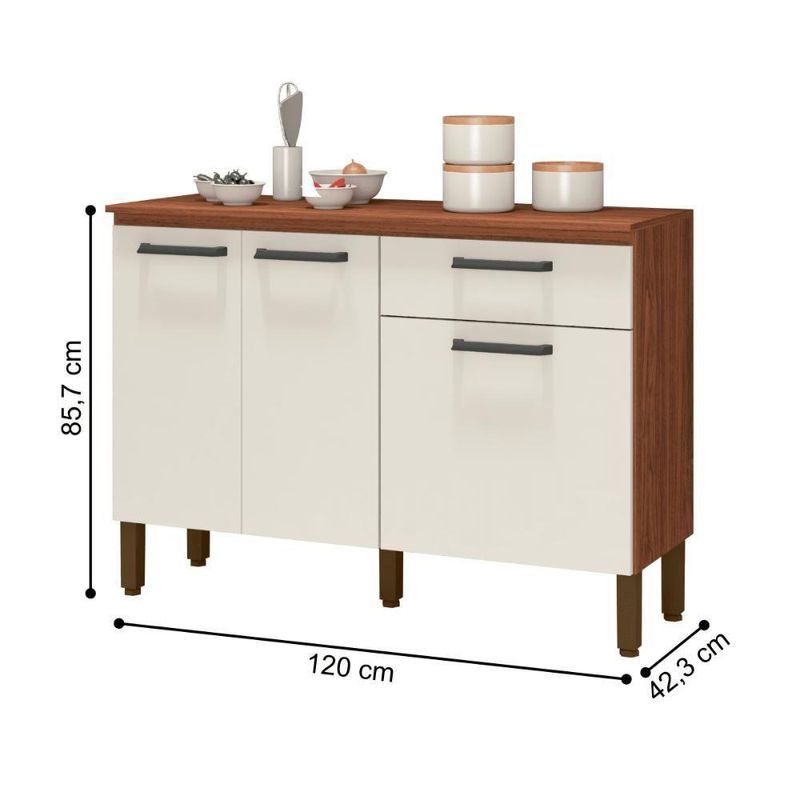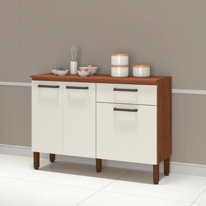 Balcão Firenze Nogueira Off-whiteCom madeira reconstituída, que respeita o meio ambiente. Composto de três portas e uma gaveta, onde são utilizadas dobradiças e corrediças 100% metálicas, tampo que traz a praticidade de utilização de decorações, utensílios para cozinha e até mesmo eletrodomésticos. Os puxadores são ergonômicos em plástico resistente (poliestireno). Possui pés reguláveis em plástico resistente que garantem a estabilidade do produto. Acabamento com pintura UV.Informações do produto:Altura: 85,7 cmLargura: 120 cmProfundidade: 42,3 cmPortas: Sim (3)Gavetas: Sim (1)Prateleiras: Sim (1)Nichos: NãoPés: Sim (5)Cor: Nogueira Off WhiteItens inclusos:01 ArmárioKit completo para montagem e manual de instruçõesGarantia: 3 meses.Informações Complementares:- Verificar o tamanho e detalhes do produto antes da compra.- Fotos meramente ilustrativa.- A transportadora entregará o produto no andar térreo do endereço de entrega.- Avaliar a mercadoria no ato do recebimento e recusar em caso de divergência ou avarias.- Não nos responsabilizamos pela montagem e desmontagem do produto no ato da entrega e devolução, assim como os custos gerados nestas situações.- Sugerimos a contratação de um montador profissional para a montagem do produto. Não nos responsabilizamos por avarias causadas no ato da montagem. Weight: 300.0 | Tonalidade (Leroy): Marrom | Tipo de Cama/Cabeceira: Padrão | Fabricante: Mobiliar Home Shop | Height: 7 | Peso Produto Com Embalagem (Kg): 30 | Modelo: Firenze | REQUIRES_ASSEMBLY: Sim | Comprimento Produto com Embalagem (cm): 124,3 | Width: 67 | Length: 124 | Largura Produto com Embalagem (cm): 67,7 | Num. Volumes: 1 | Altura do Produto com Embalagem (cm): 7,6 | Color: Marrom | Material para Filtro: MDP