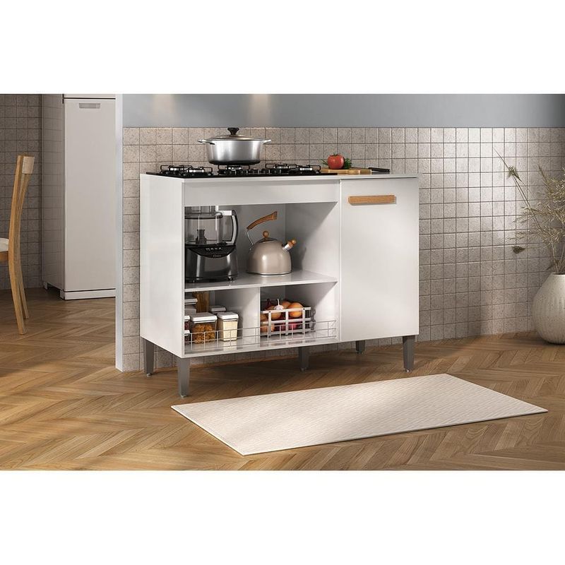 resistência e design moderno em um só móvel. Com dimensões perfeitas para cozinhas compactas ou planejadas, ele acomoda cooktops de até 5 bocas e ainda oferece espaço interno organizado para armazenar mantimentos e utensílios. Fabricado com estrutura em MDP e MDF de alta qualidade, o balcão conta com acabamento em pintura UV, conferindo maior durabilidade e proteção ao móvel. Seu tampo resistente é ideal para suportar o calor do cooktop, enquanto as divisórias internas e a porta com dobradiça de bater proporcionam organização prática e acessível no dia a dia. Ideal para cooktops de até 5 bocas 1 porta com dobradiça de bater e divisórias internas para utensílios Tampo resistente com acabamento UV Pés fixos com regulagem para maior estabilidade Design funcional para cozinhas modernas Os pés fixos com regulagem de altura garantem estabilidade mesmo em pisos irregulares. Um móvel indispensável para quem valoriza funcionalidade e estética na cozinha.