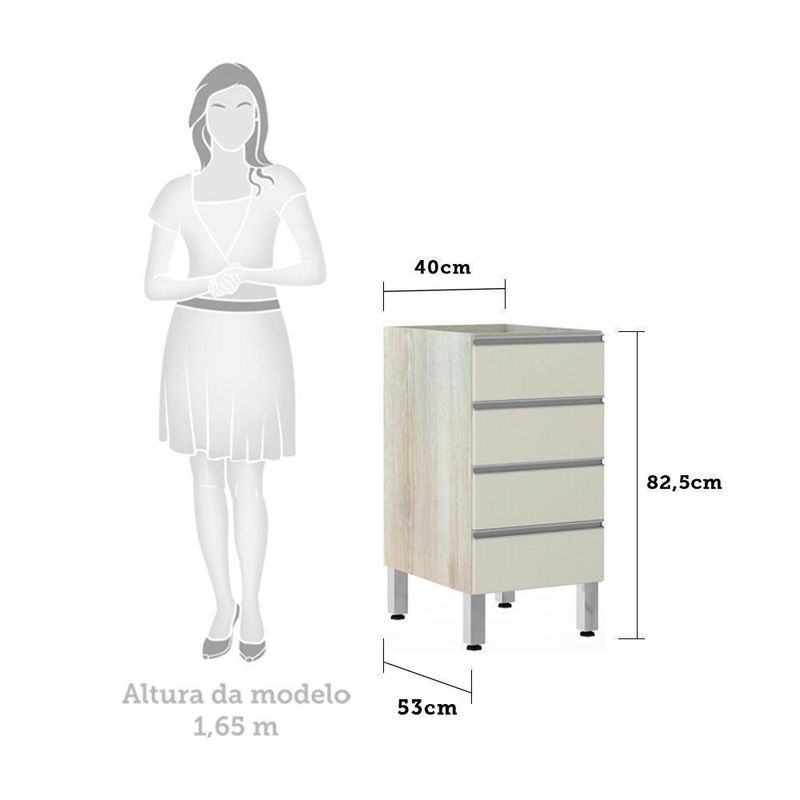 Balcão De Cozinha Sem Tampo 40cm 4 Gavetas Lis Luciane Móveis Legno Crema Com KashmirBalcão Luciane Lis perfeito para sua cozinha. Características: Corpo/Caixaria: MDP Legno Crema FF. Frontais: MDP - BP. Dobradiças: Ø35mm. Puxadores: Alumínio Gola - Prata. Pés: P S - Cromado. Gavetas: 4 Itens inclusos: Manual de montagem, ferragens e acessórios. Montagem com cavilhas e parafusos. Dimensões do produto: Altura: 82,5 cm Largura: 40 cm Profundidade: 53 cm Peso: 20,4 kg Garantia de 3 meses direto do fabricante. Informações complementares: Fique de olho: siga sempre as orientações do fabricante e utilize seu produto de acordo com o manual. A empresa não se responsabiliza pelo mau uso do produto, o que pode causar perda da garantia.#8239; Certifique se que seus dados estejam atualizados, como endereço e um telefone válido. A entrega será realizada no térreo, sendo assim em prédios o deslocamento da mercadoria, subir escadas, elevadores ou transporte por guincho para apartamentos fica sob responsabilidade do comprador. Todas as nossas entregas são realizadas em horário comercial, não sendo possível fazer agendamento, sugerimos acompanhar o rastreio do pedido e ter alguém para receber no endereço indicado. Não nos encarregamos por montagens, desmontagens e outras instalações, serão de responsabilidade do comprador.
