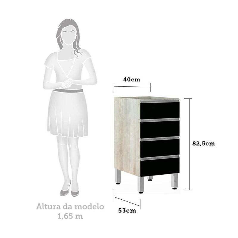 Balcão De Cozinha Sem Tampo 40cm 4 Gavetas Lis Luciane Móveis Legno Crema Com Preto TxBalcão Luciane Lis perfeito para sua cozinha. Características: Corpo/Caixaria: MDP Legno Crema FF. Frontais: MDP - BP. Dobradiças: Ø35mm. Puxadores: Alumínio Gola - Prata. Pés: P S - Cromado. Gavetas: 4 Itens inclusos: Manual de montagem, ferragens e acessórios. Montagem com cavilhas e parafusos. Dimensões do produto: Altura: 82,5 cm Largura: 40 cm Profundidade: 53 cm Peso: 20,4 kg Garantia de 3 meses direto do fabricante. Informações complementares: Fique de olho: siga sempre as orientações do fabricante e utilize seu produto de acordo com o manual. A empresa não se responsabiliza pelo mau uso do produto, o que pode causar perda da garantia.#8239; Certifique se que seus dados estejam atualizados, como endereço e um telefone válido. A entrega será realizada no térreo, sendo assim em prédios o deslocamento da mercadoria, subir escadas, elevadores ou transporte por guincho para apartamentos fica sob responsabilidade do comprador. Todas as nossas entregas são realizadas em horário comercial, não sendo possível fazer agendamento, sugerimos acompanhar o rastreio do pedido e ter alguém para receber no endereço indicado. Não nos encarregamos por montagens, desmontagens e outras instalações, serão de responsabilidade do comprador.