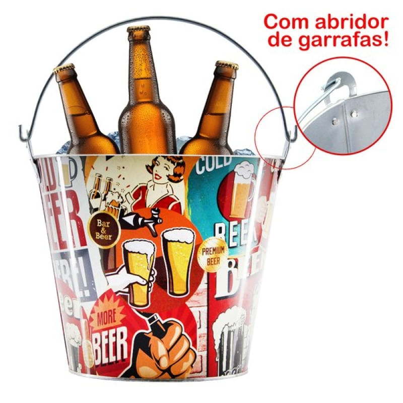 Balde De Gelo Para Cerveja Estampado Em Metal Galvanizado 4,8 Litros - O balde de gelo é ideal para manter a temperatura certa por muito mais tempo e serve tanto pra gelar bebidas mais finas, como espumantes e vinhos ou até mesmo latas, garrafas de cerveja e refrigerante. A maior vantagem do balde de gelo é na hora de servir, já que os convidados não precisam se levantar o tempo todo pra pegar mais bebida gelada, né? Além disso, nem precisa trocar o gelo toda hora. Se divirta sem preocupação, dando um up em sua decoração no momento especial de seus eventos, festas e diversão com os amigos. E aposto que seus convidados iram amar!! Descrição do produto: - Material: Metal galvanizado e Tinta a Base de Resina Epoxi - Uso: Gelar e manter a temperatura por mais tempo de suas bebidas, dando um toque especial na sua decoração. Dimensões aproximadas: • Altura: 19cm • Diâmetro Boca: 24cm • Capacidade: 4,8 Litros Características Gerais do Produto: • Material: Alumínio Garantia: • Garantia do site - 1 Mês