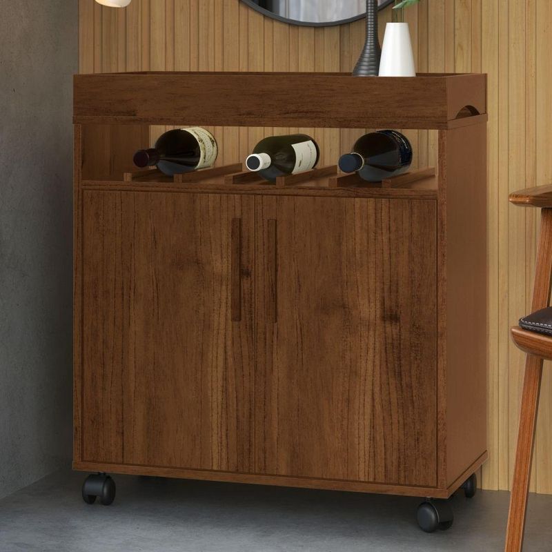 Bancada Bar Renens Canela Com 2 PortasO Aparador Adega é ideal para deixar seu ambiente ainda mais aconchegante.Possui espaço para organizar até 7 garrafas, e 2 portas para você guardar o que preferir.Dispõe de uma bandeja fixa de 7cm com alças.Suporta até 50 kg distribuídos.Dimensões do produto:Altura: 74 cmLargura: 67,5 cmComprimento: 35,5 cmInformações adicionais:Material Pricipal: MDPGavetas: NãoPortas: Sim (2)Tipo de Pés: RodíziosPeso Suportado: 50 Kg distribuídosCor: CanelaItens inclusos:01 Aparador AdegaKit completo para montagem e manual de instruções.Garantia:3 mesesInformações Complementares:- Fotos meramente ilustrativas do produto no ambiente.- Os objetos que ambientam as fotos não acompanham o produto;- Verificar descrição e tamanho do produto antes da compra.- Avaliar a mercadoria no ato do e recusar em caso de divergência ou .- Mantenha as informações de e de atualizados para entrarmos em caso necessário.- Limpar com flanela ou pano macio seco, não utilizar produtos abrasivos, desengordurantes, álcool ou solvente. Não expor o produto diretamente à luz solar e à umidade.* Sugerimos a contratação de um montador para a montagem do produto. Não nos responsabilizamos por causadas no ato da montagem.* Não nos responsabilizamos pela montagem e desmontagem do produto no ato da e , assim como os custos gerados nestas situações.* A transportadora entregará o produto no andar térreo do de .* Não nos responsabilizamos por subir escadas, corredores e elevadores ou por guincho em apartamentos.
