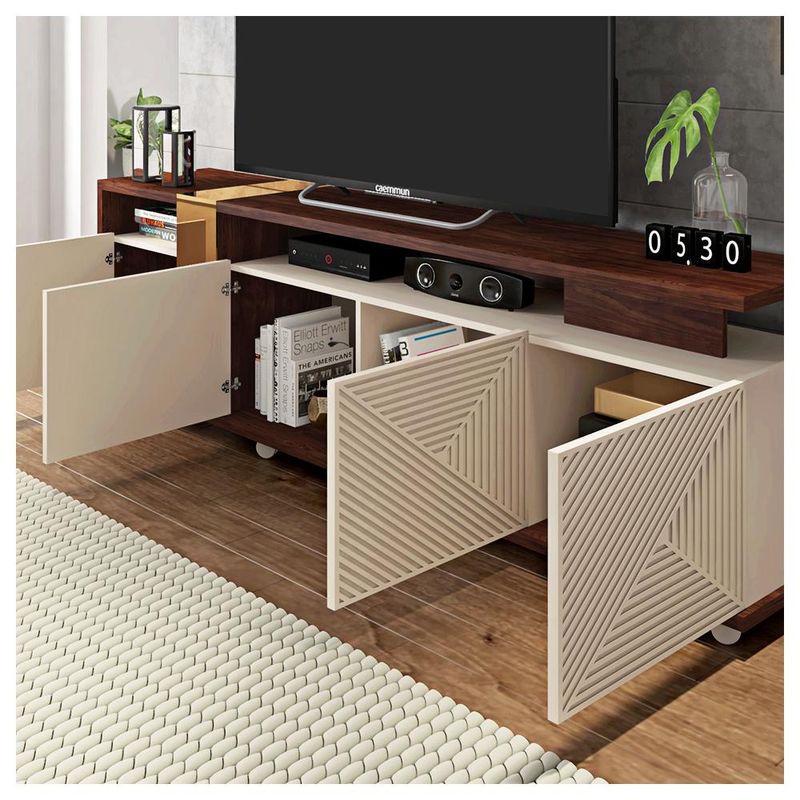 Caemmun - Rack Bancada Para TV até 75 Polegadas ColumbusO Rack Columbus irá completar seu ambiente, possui elegância além de um design único e exclusivo. Suporta Televisores de até 75 Polegadas além de possuir 4 portas com amplo espaço de armazenamento. Feito em MDP e HDF possui maior durabilidade e resistência, transmitindo maior segurança ao móvel.Dimensões do Produto Montado:Altura: 62 cmLargura: 199,5 cmProfundidade: 38 cmPeso: 50,2kg- Possui 2 Nichos- Possui 8 Rodízios- Possui 4 Portas com detalhe 3D laser- Suporta Televisores até 75 Polegadas- Possui vidro reflecta com pintura em cobre- Acompanha manual de montagem- Contém furação para passagem de fios- Tonalidade do Produto: Havana (Fosco) / Off White (Brilho)- Estrutura em MDP de 15mm e 25mm de espessura. HDF de 3mm de espessuraPeso suportado:- Base 10kg- Nicho 5kg- Tampo 25kg- Nicho Lateral 1kg- Garantia 90 dias contra defeito de fabricação- Este móvel chegará em sua casa separado em 2 volumesDimensões da embalagem: (1º Volume)Altura: 11 cmLargura: 151 cmComprimento: 39 cmDimensões da embalagem: (2º Volume)Altura: 5 cmLargura: 206 cmComprimento: 39 cmRecomendações de limpeza:- Limpar com pano macio, seco ou úmido, sem uso de produtos abrasivos. Pois, podem trazer danos ao produto.Sobre a entrega:- As transportadoras contratadas, não realizam entregas em apartamentos. Realizando assim a entrega na portaria do prédio.*Produto segue desmontado, montagem por conta do comprador.*Imagens do produto são meramente ilustrativa.