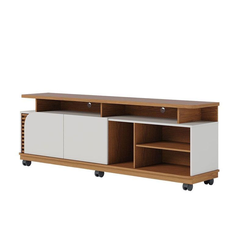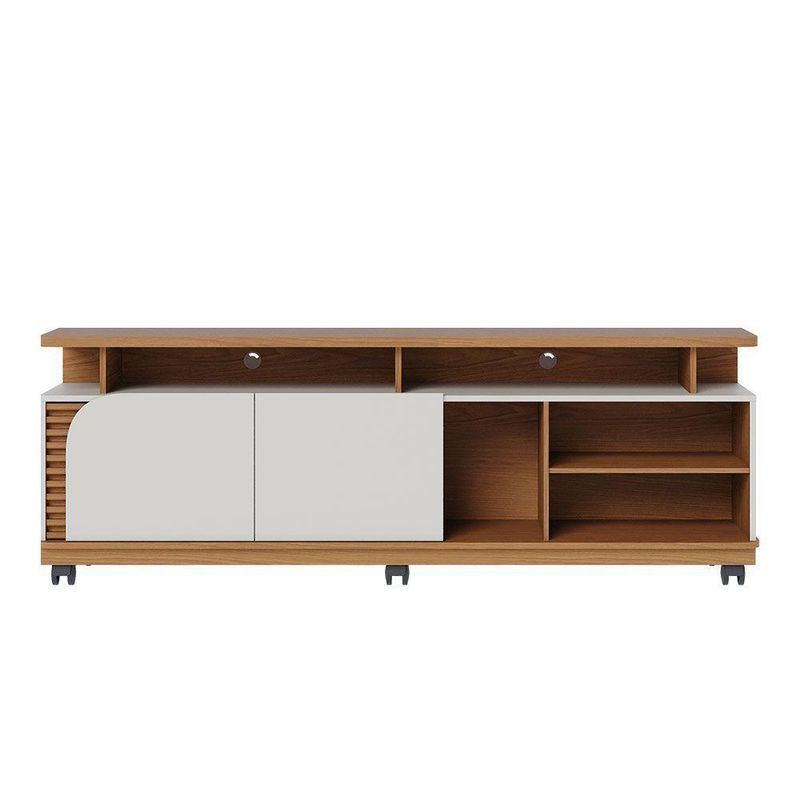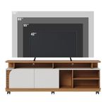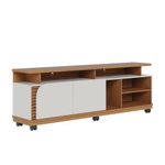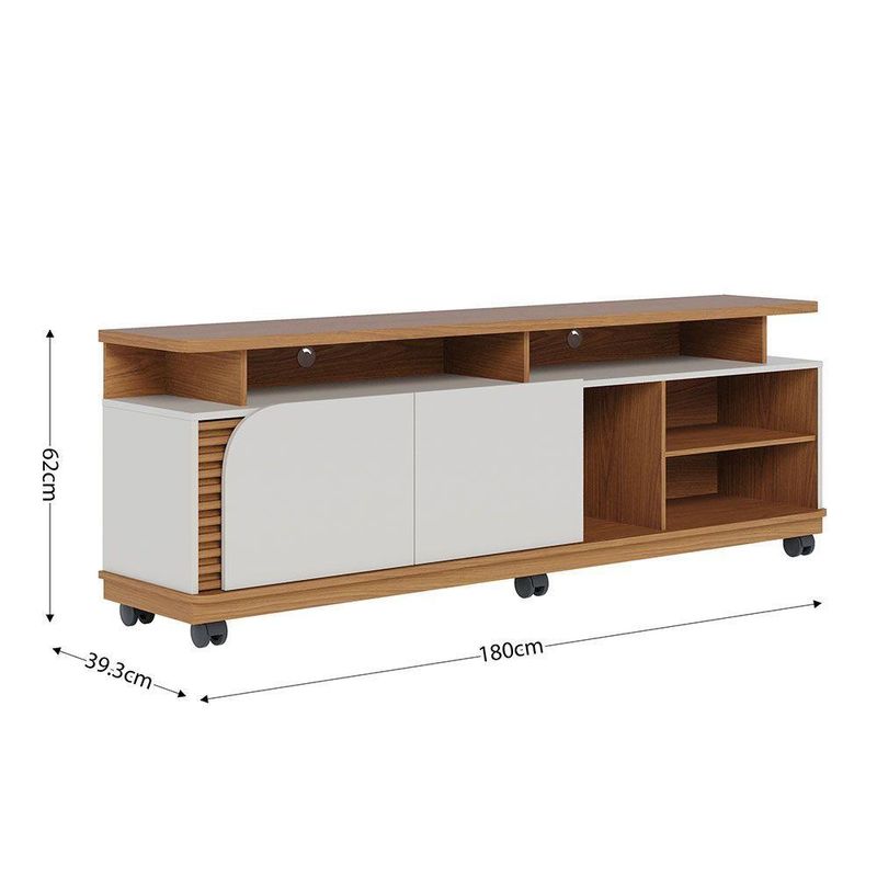 Bancada Tv De 75'' 2 Portas Com Rodízio Ewa 180cm C04 - D'rossi Amendoa E Verde PistacheO Rack Bancada Ewa 1.8 é a combinação perfeita de elegância e funcionalidade, ideal para transformar sua sala de estar em um ambiente moderno e aconchegante. Seu design refinado se destaca pelos apliques ripados decorativos, que adicionam um toque de sofisticação, e pela porta de quina assimétrica usinada, que confere um visual exclusivo e contemporâneo. Com um tampo robusto de 25mm e detalhes suspensos, essa bancada oferece não apenas resistência, mas também um acabamento sofisticado. O nicho amplo permite organizar eletrônicos e itens decorativos com praticidade, enquanto as duas portas de giro proporcionam espaço extra para armazenar objetos de forma discreta. Projetado para suportar TVs de até 75 polegadas, o Rack Ewa também conta com 6 rodízios embutidos, facilitando a movimentação do móvel conforme a necessidade do ambiente. Se você busca um móvel funcional, sofisticado e versátil, o Rack Bancada Ewa é a escolha ideal para elevar o estilo da sua sala de estar! Dimensões do Produto: Altura: 62 cm Largura: 180 cm Profundidade: 39,3 cm Altura dos Pés/Rodízios: 9 cm Peso: 42 kg Características do Produto: Material da Estrutura: MDP 25mm, 15mm e 12mm, MDF 15mm e HDF 3mm Acabamento: UV Revestimento: Pintura Escala de Brilho: Fosco Peso Suportado: 30 kg distribuídos Possui Prateleiras: Sim Quantidade de Prateleiras: 1 Prateleira Possui Portas: Sim Quantidade de Portas: 2 Portas Tipo Porta: Convencional de Giro Material da Dobradiça: Metálica Revestimento da Borda: Fitas de borda em papel Possui Gavetas: Não possui Possui Nichos: Sim Quantidade de Nichos: 5 Nichos Possui Puxador: Não possui Possui Tampo: Sim, possui Possui Pés: Sim Quantidade de Pés: 6 Rodízios Material dos Pés: Plástico Possui Vidro: Não possui Recomendado para TV: Para TVs até 75 Material dos Pés: Plástico Diferenciais: Design moderno; Porta, tampo e base com cantos curvos; Detalhe ripado. Manual de Montagem: Sim Complexidade da Montagem: Baixo Montagem: Recomendamos que seja feita por um profissional Garantia: 90 dias contra defeito de fabricação Instruções de Limpeza: Utilizar um pano limpo e levemente úmido Quantidade de Volumes: 2 Caixas Medida das Embalagens: Caixa 1 : 11,4 cm x 35,6 cm x 55,3 cm e Caixa 2 : 186,8 cm x 39,6 cm x 9,4 cm Entrega: É feita somente até o térreo ou portaria. Não levamos em andares superiores. Confira sempre as medidas das embalagens.