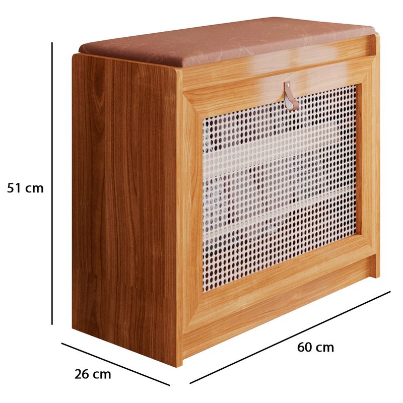 Este é um banco sapateira fabricado em madeira maciça, com acabamento em verniz PU e detalhe rústico em ratan na porta frontal.Possui formato retangular e estrutura para instalação no chão, indicado para ambientes como quartos, salas, halls e espaços multiuso.O produto inclui uma prateleira interna em madeira e suporta até 120 kg de peso distribuído.A porta é basculante, permitindo acesso ao compartimento interno.O assento é estofado com espuma D14. Requer montagem.As dimensões são: largura 60 cm, profundidade 26 cm, altura 51 cm, peso total de 7 kg. A cor apresentada é Nature/Marrom.Fabricado em madeira reflorestada.ESPECIFICAÇÕES DETALHADAS:Material principal: Madeira MaciçaAcabamento: Verniz PUDetalhe decorativo: Porta em ratanTipo de porta: BasculanteQuantidade de prateleiras: 1Assento: Estofado com espuma D14Capacidade de carga: Até 120 kgQuantidade de pares de sapatos: 6Requer montagem: SimTipo de instalação: ChãoAmbientes indicados: Halls, Entradas, Quartos, Salas, MultiusoPeso do produto: 7 kgDimensões (L x P x A): 60 cm x 26 cm x 51 cmCor: Nature/MarromMarca: CarismaFabricante: Carisma MóveisTABELA TÉCNICA FINAL:Tipo de Produto: Sapateira Banco EstofadoModelo / Linha: Porta em RatanMarca: CarismaCor: Nature/MarromMaterial Principal: Madeira MaciçaAcabamento: Verniz PUDetalhe Decorativo: Porta em RatanTipo de Porta: BasculanteQuantidade de Prateleiras: 1Assento Estofado: SimTipo de Espuma: D14Capacidade de Carga: 120 kgQuantidade de Pares de Sapatos: 6Requer Montagem: SimTipo de Instalação: ChãoAmbientes Indicados: Halls, Entrada, Quartos, Salas, MultiusoPeso do Produto: 7 kgLargura: 60 cmProfundidade: 26 cmAltura: 51 cmFabricação: Madeira Reflorestada