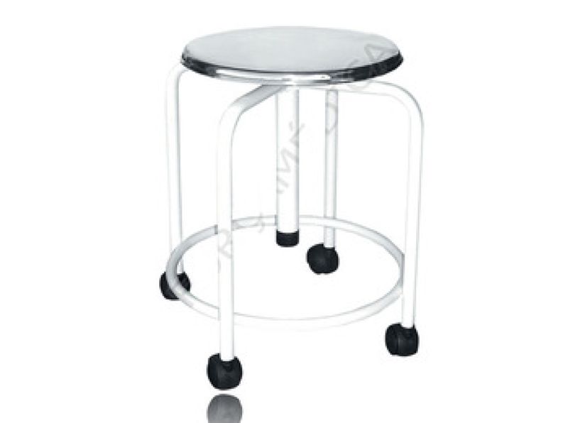 Estrutura de quatro pés em tubos de aço com 19,05mm de diâmetro, com pintura epóxi de estufa, assento em aço inoxidável com 0,27 mt de diâmetro, com regulagem de altura mínima de 0,42 mt e máxima de 0,62 mt, com quatro rodízios de pvc preto com 50mm de diâmetro. Sistema de elevação por rosca. Código: FM0128