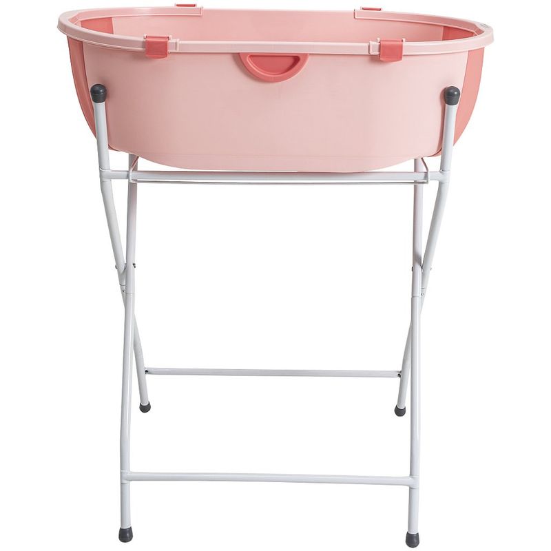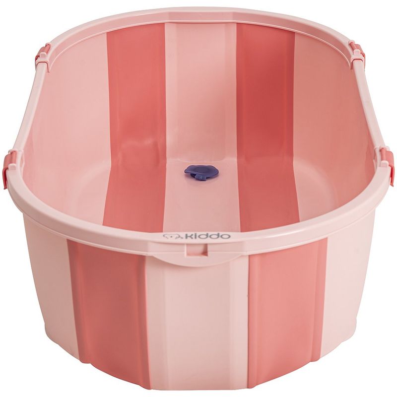 Banheira Dobrável Flap Plus Rosa com Suporte - Kiddo banheira dobrável. válvula para escoamento da água. design moderno. fechamento compacto. estrutura plástica. pode ser utilizada desde recém nascido. limite de peso: 40 kg (água + criança) no chão Peso da banheira: 1,5 kgs Acompanha o suporte alto. Medidas: A 25 x L 46 x C 78 Medidas do produto na caixa: A 81 x L 56 x C 21