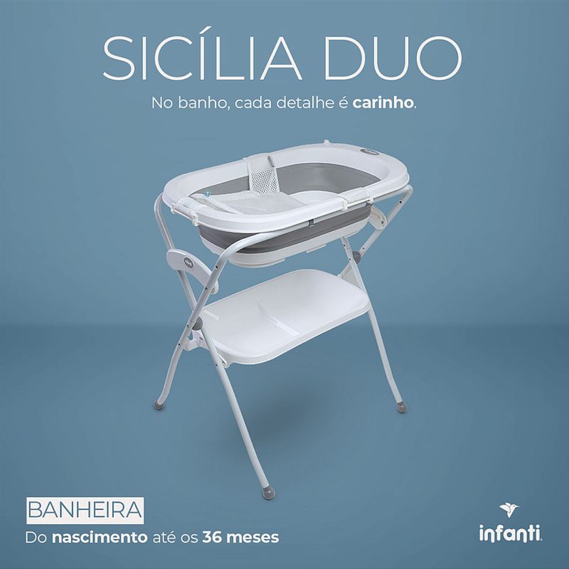 Banheira Sicília Duo - Infanti Uma banheira versátil e compacta, para que o banho do bebê tenha o mesmo toque de carinho em todas as fases e lugares. O banho é um momento de conexão, relaxamento e descobertas entre pais e bebês. E para tornar essa experiência ainda mais especial, apresentamos a Banheira Sicilia Duo, que combina funcionalidade, segurança e praticidade em cada detalhe. Desde os primeiros dias de vida, ela oferece o suporte ideal para um banho tranquilo e aconchegante. Seu design dobrável permite fácil armazenamento e transporte, sem abrir mão do conforto. Pode ser usada no suporte ou diretamente no chão, se adaptando à sua rotina e ao seu espaço. O redutor para recém-nascidos garante mais segurança nos primeiros banhos, enquanto a bandeja organizadora mantém tudo à mão para que você aproveite esse momento sem preocupações. Com a Banheira Sicilia Duo, seu bebê cresce envolvido em cuidado e carinho, transformando cada banho em uma experiência. A banheira é prática e confortável, acompanhando todas as fases do seu bebê. É retrátil, perfeita para guardar ou levar em viagens, otimizando o espaço. Pode ser usada com suporte até os 6 meses ou direto no chão até os 3 anos. Redutor removível para recém-nascidos, proporcionando mais segurança e conforto. Bandeja organizadora para toalhas e objetos essenciais, facilitando a rotina do banho. Estrutura leve e compacta: fácil de abrir, fechar, armazenar e levar nas viagens ou passeios. Acompanha mangueira para fácil escoamento da água. Capacidade água: 35 L Peso do Produto: 5,15 Dimensões Externa do Produto (A x L x P | cm): 92,5 x 49,5 x 65,3 Registro: Isento
