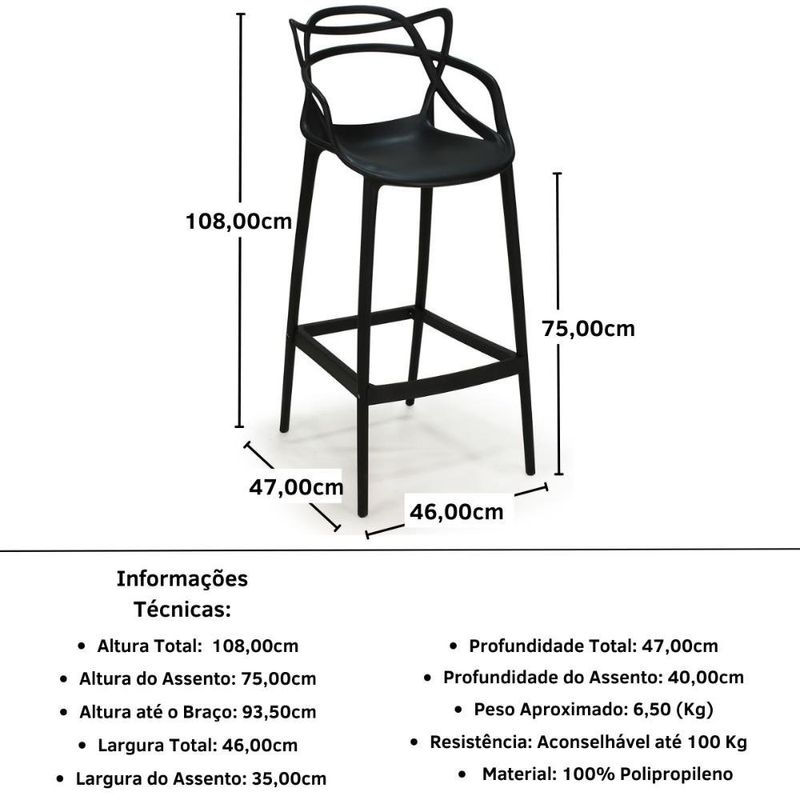 Banqueta Alta Masters Allegra A Banqueta Alta Allegra é uma opção moderna e sofisticada que vai deixar a sua casa ainda mais elegante! Perfeita para ser utilizada em bancadas, bares e cozinhas americanas, essa banqueta é extremamente confortável. Com um encosto curvado que se molda perfeitamente ao corpo, proporciona uma postura adequada e aconchegante. Por ser uma Banqueta Alta ela se adapta a diferentes alturas de bancada, tornando-a versátil e prática. A Banquetas Alta Allegra é feita totalmente em polipropileno de alta qualidade, material que traz um toque de elegância e sofisticação para qualquer ambiente. Além disso, essa banqueta é fácil de limpar e resistente, garantindo uma aparência sempre nova e impecável. Com a Banqueta Alta Allegra, você não precisa mais escolher entre qualidade, conforto e design - esse produto reúne tudo isso em um só lugar! ------------------------------------------------------------------------------------------ Especificações Técnicas do Produto: > Modelo: Banqueta Allegra > Material: 100% Polipropileno > Altura Total: 108,00 (cm) > Altura do Assento: 75,00 (cm) > Altura até o braço: 93,50 (cm) > Largura Total: 46,00 (cm) > Largura do Assento: 35,00 (cm) > Profundidade Total: 47,00 (cm) > Profundidade do Assento: 40,00 (cm) > Distância de um braço ou outro: 48,00 (cm) > Peso Aproximado: 6,50 (Kg) > Resistência: Aconselhável até 100 (Kg) > Acompanha Manual: Acompanha manual de montagem (não nos responsabilizamos pela montagem do produto). > Garantia: 03 Meses Contra Defeitos de Fabricação. ------------------------------------------------------------------------------------------ Observações de Entrega: Os entregadores não são autorizados: > Entrar no domicílio, sem estar acompanhado pelo cliente; > Entrar ou subir desacompanhado em prédio residencial ou comercial, o cliente precisa receber o pedido na portaria; > Entregar por meios alternativos (exemplo: içar produto por janela, subir escadas); > Entregar em edifícios, entrega será realizada apenas na portaria; > Realizar montagens, instalação ou manutenção de produtos; > Abrir a embalagem do produto; > Realizar entrega em endereço diferente do que consta na Nota Fiscal; > Realizar entrega a menor de idade ou sem documento de identificação;