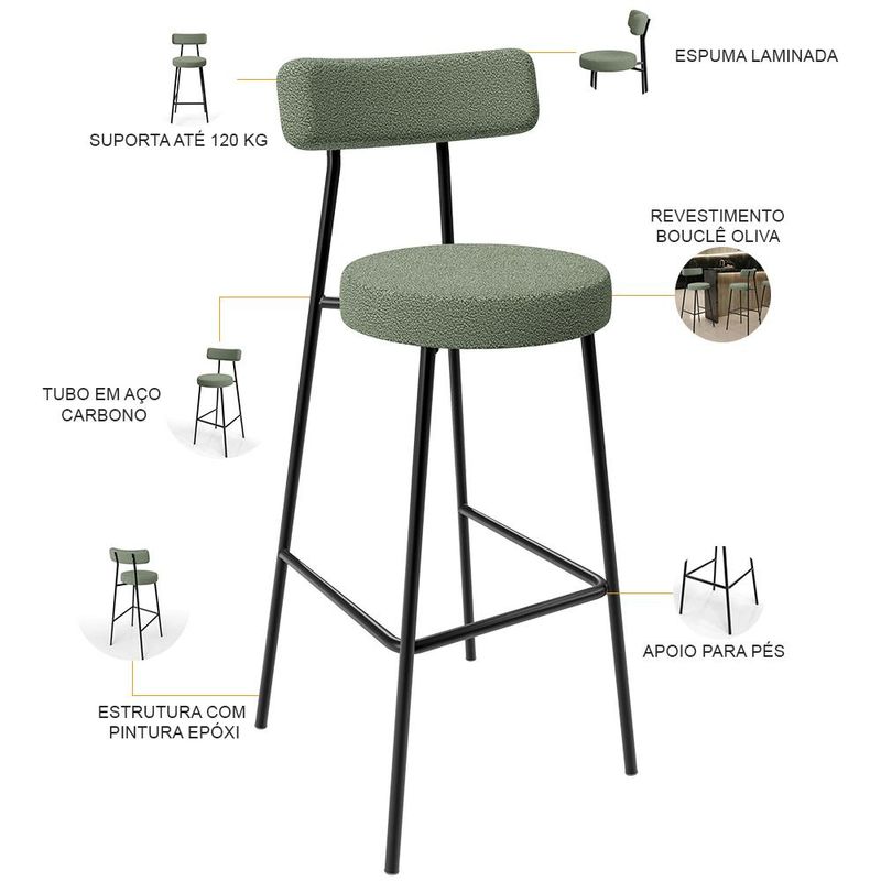 Amplamente moderna, dispondo de muito realce e design singular, a Banqueta Alta Bar Cozinha Sala De Jantar Estrutura Em Aço Milão L02 Bouclê Oliva - Lyam Decor vem com a personalidade e elegância que sua decoração merece! Estruturada em aço carbono, contrasta lindamente com o encosto e assento estofados, cabe mencionar ainda seu revestimento em Bouclê, é confeccionada por materiais de excelente qualidade, extremamente resistentes e aconchegantes. Possui altura ideal, garantindo o encaixe perfeito no ambiente, otimizando seu espaço e promovendo máximo conforto. Pode ser disposta em bancada, cozinha americana, área gourmet ou home bar, as possibilidades são infinitas e as combinações ficarão perfeitas. Adquira já a sua!! Dimensões do Produto (L x A x P) 44 x 100 x 52 cm Medidas Internas: Altura do chão ao assento: 75 cm Altura do chão ao apoio para pés: 29 cm Altura do assento: 6 cm Largura do assento: 34 cm Altura do assento ao encosto: 26 cm Altura do encosto: 11 cm Largura do encosto: 40 cm Profundidade do encosto: 6 cm Características: Encosto e assento estofados com espuma laminada. Revestimento em Bouclê na cor Oliva. Estrutura fixa em aço carbono com pintura epóxi na cor preto. Pés com ponteiras plásticas, que permitem maior resistência e qualidade sem riscar o piso. Peso suportado de até 120 kg. Produto entregue desmontado, acompanha manual de montagem. - Por se tratar de estofado as medidas podem ter uma pequena variação de até 3 cm. - A tonalidade do produto real poderá ter ligeira variação devido o lote de tecidos. - A limpeza deve ser feita com pano levemente umedecido em água limpa, sem esfregar, não utilizar produtos abrasivos, desengordurantes, álcool ou solvente. Observações importantes: - Produto para uso residencial em ambiente interno, não devendo ficar exposto diretamente ao sol, calor e umidade excessivos. - Pode haver alguma diferença de tonalidade entre a imagem e o produto real, por conta do tratamento de imagens e a calibração de cores do seu monitor. - As imagens são meramente ilustrativas, não acompanham objetos de decoração e eletrônicos. - Ao receber a mercadoria, o cliente deve verificar as condições da embalagem, caso haja alguma avaria não assine o comprovante de recebimento. - Montagem, desmontagem e outras instalações serão de responsabilidade do cliente. Não nos responsabilizamos, no ato da entrega, por subir escadas/elevadores ou pelo transporte por guincho em apartamentos. Eventuais despesas são de responsabilidade do comprador. - Confira as dimensões do produto e certifique-se de que passará normalmente por supostos elevadores, portas, escadas e/ou corredores de sua residência.