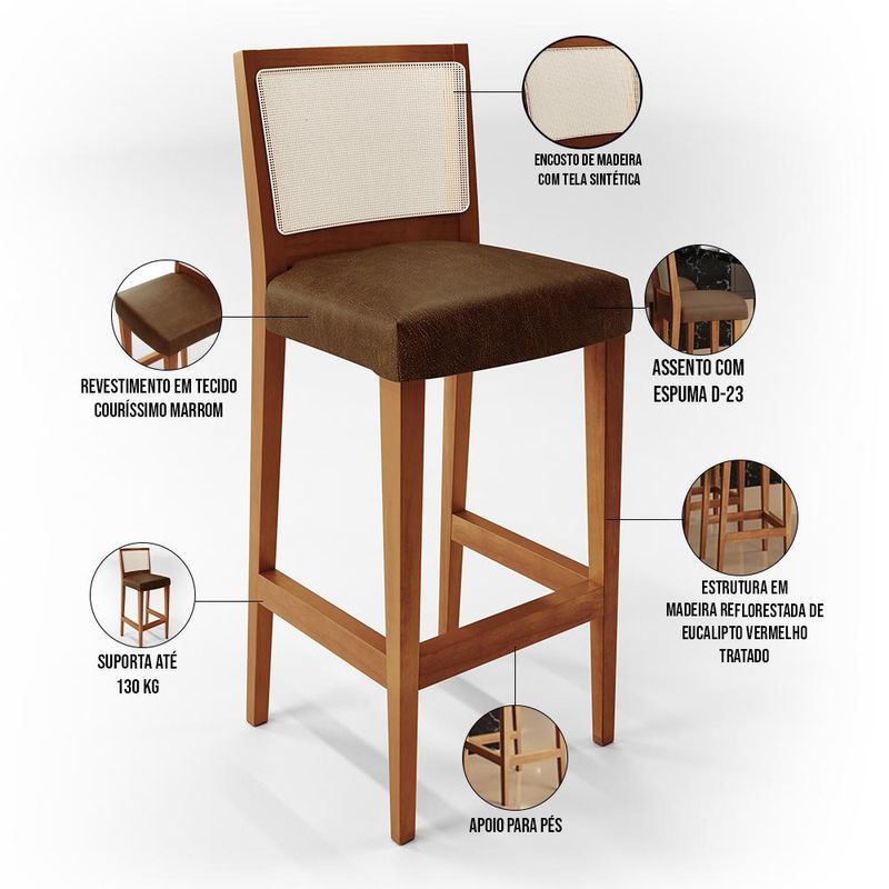 Um clássico que nunca sai de moda! Banqueta Alta Para Cozinha Sala de Jantar Fixa Telado Branco Zion L02 Linho Couríssimo Marrom - Lyam Decor, possui um estilo rustico que faltava para deixar sua casa ainda mais clássica. Seu encosto com o detalhe de tela sintética na cor branca trazem ainda mais estilo e destaque para sua decoração, junto com assento estofado que proporciona horas de conforto. A estrutura e o apoio para os pés, são responsáveis por garantir maior segurança à mesma. Pode ser acomodada em cozinha americana, ambientes integrados, espaços gourmets, bancadas ou em seu home bar, independente do lugar, ela desperta logo de cara o bom gosto e elegância, deixando tudo mais despojado, perfeita para criar um ambiente harmonioso e agradável para receber a família e amigos, sempre com muita receptividade! Características: Estrutura em madeira de reflorestamento de eucalipto vermelho tratado. Revestimento em Couríssimo Marrom de alta qualidade. Assento com espuma D-23. Encosto de madeira com tela sintética. Peso suportado: Até 130 kg. Apoio para os pés. Dimensões do produto (L x A x P) 41,5 x 103 x 50 cm Altura do chão ao assento: 75 cm Altura do encosto: 31 cm Largura do encosto: 41,5 cm Profundidade do encosto: 3,5 cm Altura do assento: 10,5 cm Largura do assento: 42,5 cm Profundidade do assento: 38,5 cm Altura do apoio para os pés: 5 cm - Por se tratar de estofado as medidas podem ter uma pequena variação de até 3 cm. - A tonalidade do produto real poderá ter ligeira variação devido o lote de tecidos. Observações importantes: - Produto para uso residencial em ambiente interno, não devendo ficar exposto diretamente ao sol, calor e umidade excessivos. - Pode haver alguma diferença de tonalidade entre a imagem e o produto real, por conta do tratamento de imagens e a calibração de cores do seu monitor. - As imagens são meramente ilustrativas, não acompanham objetos de decoração e eletrônicos. - Ao receber a mercadoria, o cliente deve verificar as condições da embalagem, caso haja alguma avaria não assine o comprovante de recebimento. - Montagem, desmontagem e outras instalações serão de responsabilidade do cliente. Não nos responsabilizamos, no ato da entrega, por subir escadas/elevadores ou pelo transporte por guincho em apartamentos. Eventuais despesas são de responsabilidade do comprador. - Confira as dimensões do produto e certifique-se de que passará normalmente por supostos elevadores, portas, escadas e/ou corredores de sua residência.