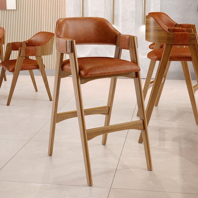 Na cozinha ou qualquer outro ambiente, a Banqueta Alta Suran, da Lyam Decor, se destaca com seu design moderno e elegante. Com uma estrutura de madeira que exala sofisticação, essa banqueta estofada é o convite perfeito para momentos de descontração e sabor. O estofado macio, harmoniza com os demais elementos do ambiente, além de proporcionar conforto enquanto se saboreia um café da manhã preguiçoso ou uma taça de vinho ao entardecer. Já o encosto curvo e os braços delicadamente projetados abraçam o corpo, transformando cada instante em uma experiência acolhedora. Ideal para a ilha gourmet, onde a criatividade culinária ganha vida, ou para um barzinho que respira estilo, essa banqueta é mais do que um móvel; é um ponto de encontro, um espaço de risadas e histórias compartilhadas. Em cada assento, a promessa de momentos memoráveis. A vida é feita de pequenas celebrações, e essa banqueta alta está pronta para torná-las ainda mais especiais. Adicione ao seu carrinho e aproveite! Dimensões da Banqueta (L x A x P) 54 cm x 105 cm x 72 cm Medidas Internas Largura do assento: 46 cm Profundidade livre do assento: 46 cm Altura do encosto: 30 cm Altura interna dos braços: 16 cm Altura dos braços ao chão: 93 cm Altura do assento ao chão: 76 cm Altura do apoio de pé ao chão: 36 cm Características: Estrutura em madeira de reflorestamento Taeda com acabamento envernizado na tonalidade Castanho. Revestimento em Couríssimo de alta qualidade na tonalidade Camel. Encosto ergonômico fixo. Assento estofado fixo composto por espuma D-23. Braços com alças laterais revestidas. Suporta até 120 kg. Produto entregue montado. - Por se tratar de estofado as medidas podem ter uma pequena variação de até 3 cm. - A tonalidade do produto real poderá ter ligeira variação devido o lote de tecidos. - A limpeza deve ser feita com pano levemente umedecido em água limpa, sem esfregar, não utilizar produtos abrasivos, desengordurantes, álcool ou solvente. Observações importantes: - Produto para uso residencial em ambiente interno, não devendo ficar exposto diretamente ao sol, calor e umidade excessivos. - Pode haver alguma diferença de tonalidade entre a imagem e o produto real, por conta do tratamento de imagens e a calibração de cores do seu monitor. - As imagens são meramente ilustrativas, não acompanham objetos de decoração e eletrônicos. - Ao receber a mercadoria, o cliente deve verificar as condições da embalagem, caso haja alguma avaria não assine o comprovante de recebimento. - Montagem, desmontagem e outras instalações serão de responsabilidade do cliente. Não nos responsabilizamos, no ato da entrega, por subir escadas/elevadores ou pelo transporte por guincho em apartamentos. Eventuais despesas são de responsabilidade do comprador. - Confira as dimensões do produto e certifique-se de que passará normalmente por supostos elevadores, portas, escadas e/ou corredores de sua residência.