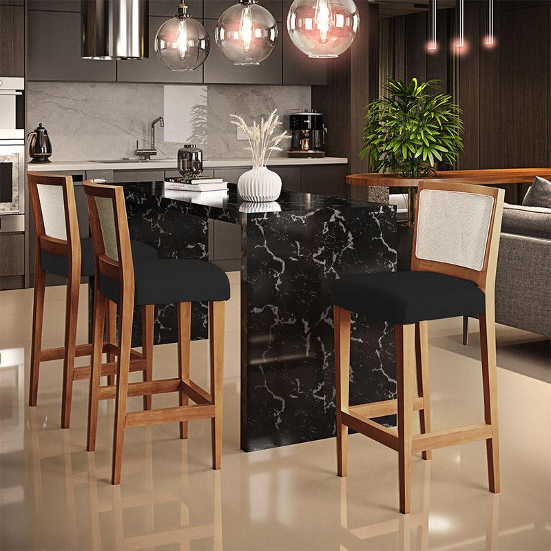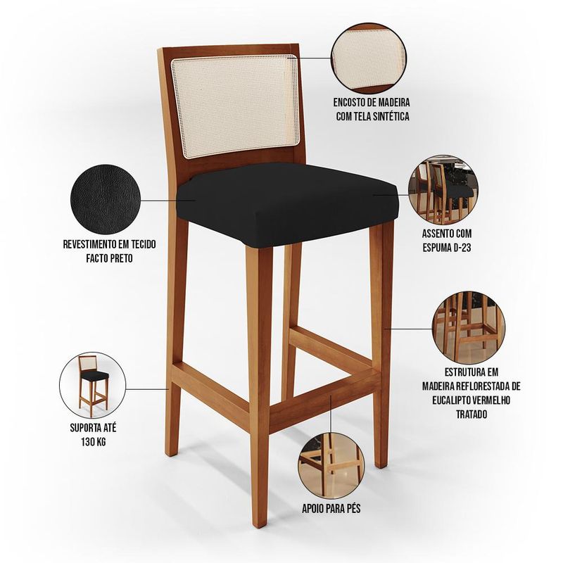 Um clássico que nunca sai de moda! A Banqueta Alta Para Cozinha Sala De Jantar Encosto Em Tela Branco Zion L02 Facto Preto - Lyam Decor, possui um estilo rustico que faltava para deixar sua casa ainda mais clássica. Seu encosto com o detalhe de tela sintética na cor branca trazem ainda mais estilo e destaque para sua decoração, junto com assento estofado que proporciona horas de conforto. A estrutura e o apoio para os pés, são responsáveis por garantir maior segurança à mesma. Pode ser acomodada em cozinha americana, ambientes integrados, espaços gourmets, bancadas ou em seu home bar, independente do lugar, ela desperta logo de cara o bom gosto e elegância, deixando tudo mais despojado, perfeita para criar um ambiente harmonioso e agradável para receber a família e amigos, sempre com muita receptividade! Características: Estrutura em madeira de reflorestamento de eucalipto vermelho tratado. Revestimento em Facto Preto de alta qualidade, acabamento fosco. Assento com espuma D-23. Encosto de madeira com tela sintética. Peso suportado: Até 130 kg. Apoio para os pés. Dimensões do produto (L x A x P) 41,5 x 103 x 50 cm Altura do chão ao assento: 75 cm Altura do encosto: 31 cm Largura do encosto: 41,5 cm Profundidade do encosto: 3,5 cm Altura do assento: 10,5 cm Largura do assento: 42,5 cm Profundidade do assento: 38,5 cm Altura do apoio para os pés: 5 cm - Por se tratar de estofado as medidas podem ter uma pequena variação de até 3 cm. - A tonalidade do produto real poderá ter ligeira variação devido o lote de tecidos. Observações importantes: - Produto para uso residencial em ambiente interno, não devendo ficar exposto diretamente ao sol, calor e umidade excessivos. - Pode haver alguma diferença de tonalidade entre a imagem e o produto real, por conta do tratamento de imagens e a calibração de cores do seu monitor. - As imagens são meramente ilustrativas, não acompanham objetos de decoração e eletrônicos. - Ao receber a mercadoria, o cliente deve verificar as condições da embalagem, caso haja alguma avaria não assine o comprovante de recebimento. - Montagem, desmontagem e outras instalações serão de responsabilidade do cliente. Não nos responsabilizamos, no ato da entrega, por subir escadas/elevadores ou pelo transporte por guincho em apartamentos. Eventuais despesas são de responsabilidade do comprador. - Confira as dimensões do produto e certifique-se de que passará normalmente por supostos elevadores, portas, escadas e/ou corredores de sua residência.